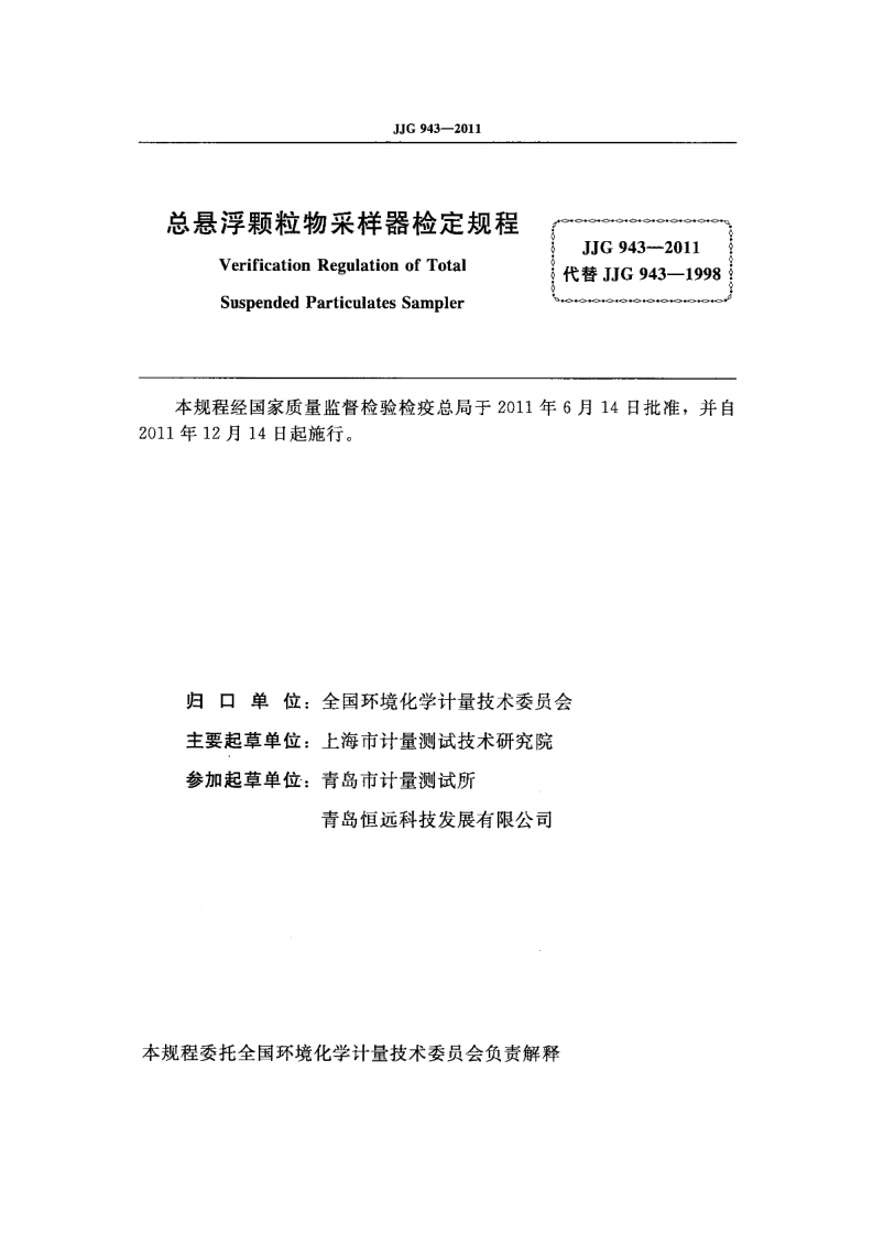 JJG943-2011总悬浮颗粒物采样器348072@abc4个月前发布关注私信1.04MB13页032JJG943-2011总悬浮颗粒物采样器此内容为付费资源,请付费后查看¥13¥23黄金会员免费钻石会员免费立即购买您当前未登录!建议登陆后购买,可保存购买订单付费资源 第1页 / 共13页 第2页 / 共13页 试读已结束,还剩11页,您可下载完整版后进行离线阅读 THE END标准规范 文本预览 J可G中华人民共和国国家计量检定规程JJG943-2011总悬浮颗粒物采样器Total Suspended Particulates Sampler2011-06-14发布2011-12-14实施国家质量监督检验检疫总局发布 查看更多 收起部分 喜欢就支持一下吧收藏