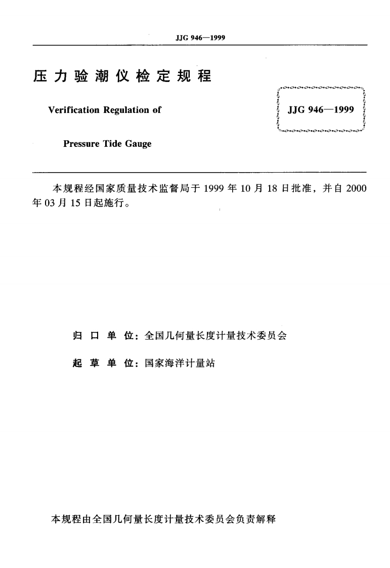 JJG946-1999压力验潮仪348072@abc4个月前发布关注私信0.25MB14页022JJG946-1999压力验潮仪此内容为付费资源,请付费后查看¥13¥23黄金会员免费钻石会员免费立即购买您当前未登录!建议登陆后购买,可保存购买订单付费资源 第1页 / 共14页 第2页 / 共14页 试读已结束,还剩12页,您可下载完整版后进行离线阅读 THE END标准规范 文本预览 可可G中华人民共和国国家计量检定规程JJG946一1999压力验潮仪Pressure Tide Gauge1999-10-18发布2000-03-15实施国家质量技术监督局发布 查看更多 收起部分 喜欢就支持一下吧收藏