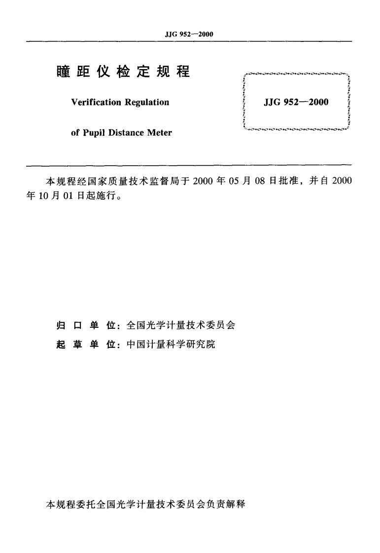 JJG952-2000瞳距仪348072@abc4个月前发布关注私信0.22MB11页032JJG952-2000瞳距仪此内容为付费资源,请付费后查看¥13¥23黄金会员免费钻石会员免费立即购买您当前未登录!建议登陆后购买,可保存购买订单付费资源 第1页 / 共11页 第2页 / 共11页 试读已结束,还剩9页,您可下载完整版后进行离线阅读 THE END标准规范 文本预览 可订G中华人民共和国国家计量检定规程JJG952一2000瞳距仪Pupil Distance Meter2000-05-08发布2000-10-01实施国家质量技术监督局发布 查看更多 收起部分 喜欢就支持一下吧收藏