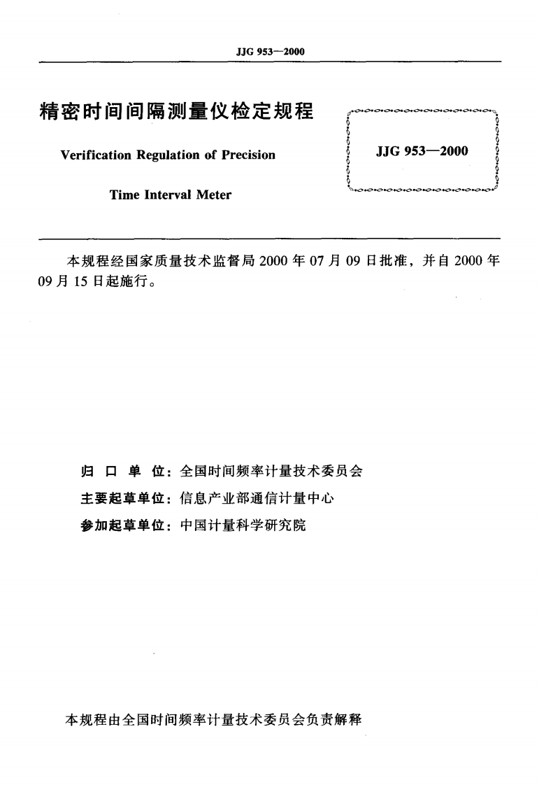 JJG953-2000精密时间间隔测量仪348072@abc4个月前发布关注私信0.18MB10页021JJG953-2000精密时间间隔测量仪此内容为付费资源,请付费后查看¥13¥23黄金会员免费钻石会员免费立即购买您当前未登录!建议登陆后购买,可保存购买订单付费资源 第1页 / 共10页 第2页 / 共10页 试读已结束,还剩8页,您可下载完整版后进行离线阅读 THE END标准规范 文本预览 可河G中华人民共和国国家计量检定规程JJG953-2000精密时间间隔测量仪Precision Time Interval Meter2000-07-09发布2000-09-15实施国家质量技术监督局发布 查看更多 收起部分 喜欢就支持一下吧收藏