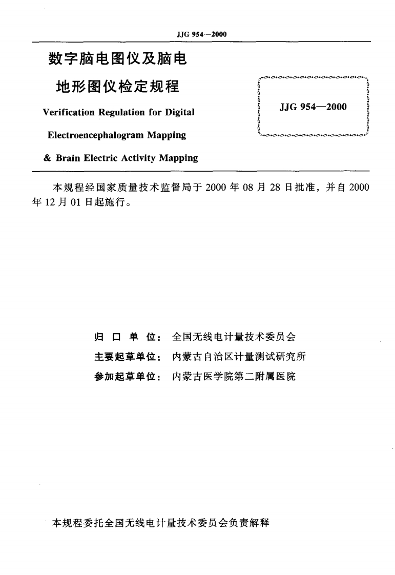 JJG954-2000数字脑电图仪及脑电地形图仪348072@abc4个月前发布关注私信0.31MB14页025JJG954-2000数字脑电图仪及脑电地形图仪此内容为付费资源,请付费后查看¥13¥23黄金会员免费钻石会员免费立即购买您当前未登录!建议登陆后购买,可保存购买订单付费资源 第1页 / 共14页 第2页 / 共14页 试读已结束,还剩12页,您可下载完整版后进行离线阅读 THE END标准规范 文本预览 可G中华人民共和国国家计量检定规程JJG954-2000数字脑电图仪及脑电地形图仪Digital ElectroencephalogramMapping Brain Electric Activity Mapping2000-08-28发布2000-12-01实施国家质量技术监督局发布 查看更多 收起部分 喜欢就支持一下吧收藏