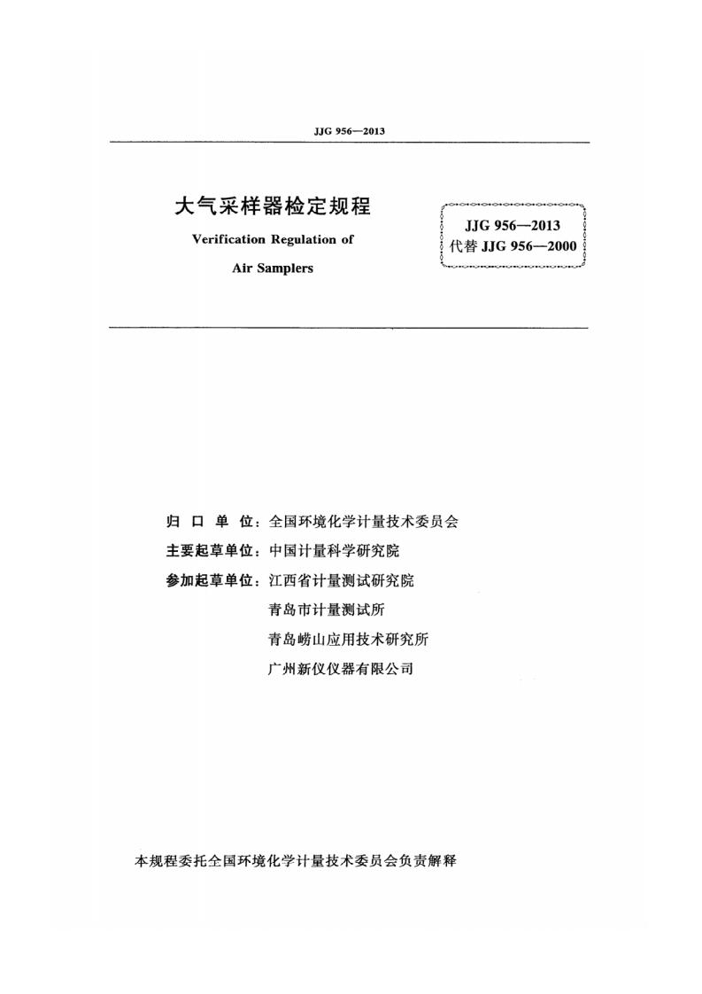 JJG956-2013大气采样器348072@abc4个月前发布关注私信1.99MB16页023JJG956-2013大气采样器此内容为付费资源,请付费后查看¥13¥23黄金会员免费钻石会员免费立即购买您当前未登录!建议登陆后购买,可保存购买订单付费资源 第1页 / 共16页 第2页 / 共16页 试读已结束,还剩14页,您可下载完整版后进行离线阅读 THE END标准规范 文本预览 可可G中华人民共和国国家计量检定规程JJG956-2013大气采样器Air Samplers2013-04-27发布2013-11-27实施国家质量监督检验检疫总局发布 查看更多 收起部分 喜欢就支持一下吧收藏
