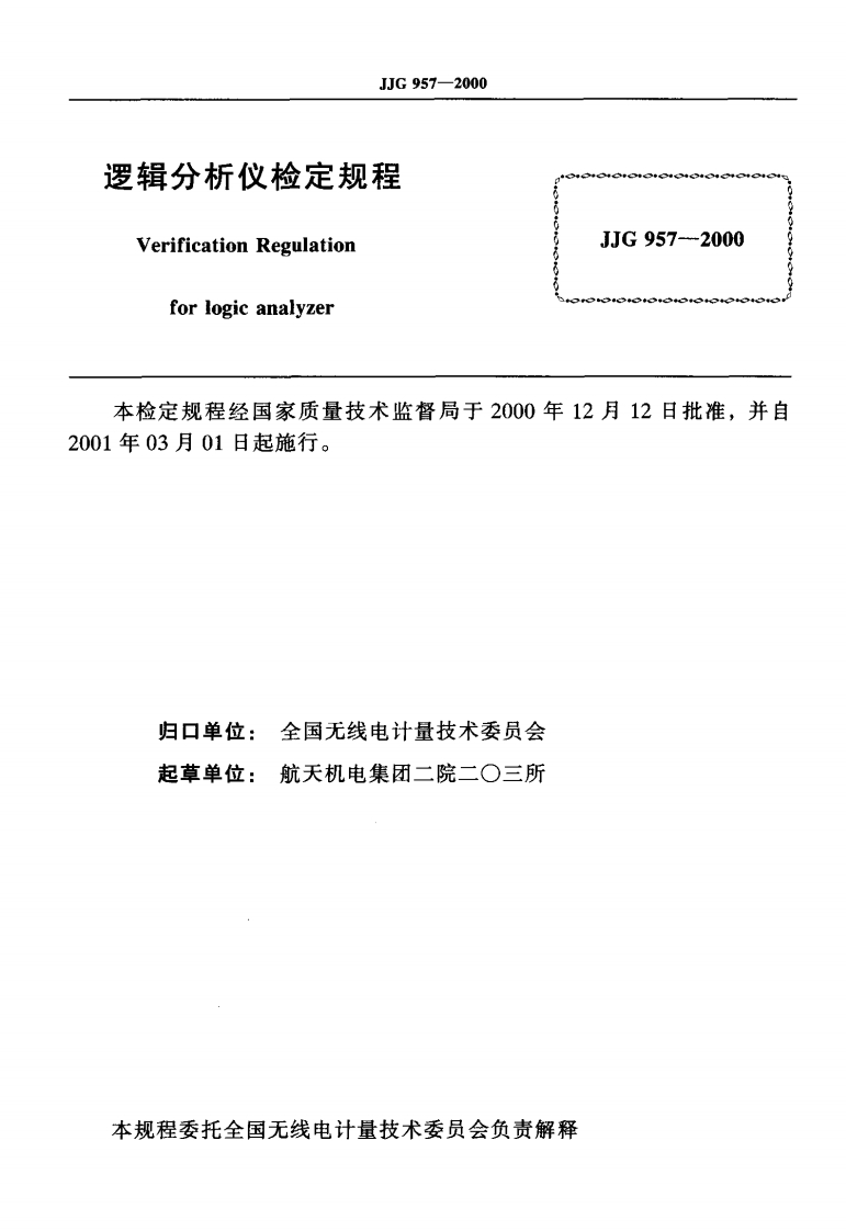 JJG957-2000逻辑分析仪348072@abc4个月前发布关注私信0.28MB15页024JJG957-2000逻辑分析仪此内容为付费资源,请付费后查看¥13¥23黄金会员免费钻石会员免费立即购买您当前未登录!建议登陆后购买,可保存购买订单付费资源 第1页 / 共15页 第2页 / 共15页 试读已结束,还剩13页,您可下载完整版后进行离线阅读 THE END标准规范 文本预览 可G中华人民共和国国家计量检定规程JJG957一2000逻辑分析仪Logic Analyzer2000-12-12发布2001-03-01实施国家质量技术监督局发布 查看更多 收起部分 喜欢就支持一下吧收藏