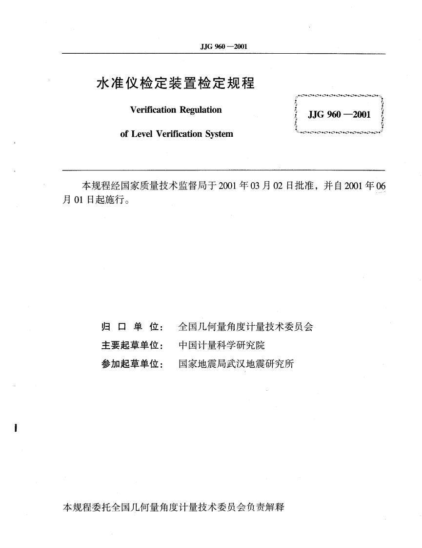 JJG960-2001水准仪检定装置检定规程348072@abc4个月前发布关注私信0.53MB14页028JJG960-2001水准仪检定装置检定规程此内容为付费资源,请付费后查看¥13¥23黄金会员免费钻石会员免费立即购买您当前未登录!建议登陆后购买,可保存购买订单付费资源 第1页 / 共14页 第2页 / 共14页 试读已结束,还剩12页,您可下载完整版后进行离线阅读 THE END标准规范 文本预览 可可G中华人民共和国国家计量检定规程JJG960-2001水准仪检定装置Level Verification System2001-03-02批准2001-06-01实施国家质量技术监督局发布 查看更多 收起部分 喜欢就支持一下吧收藏