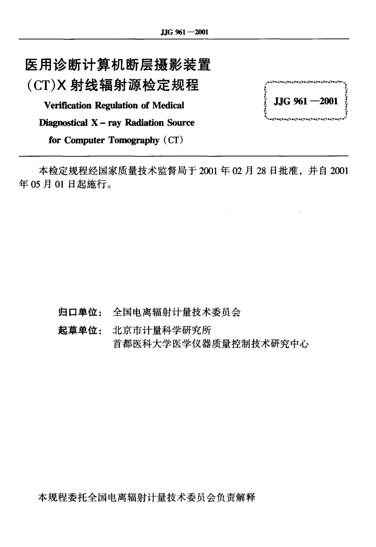JJG961-2001医用诊断计算机断层摄影装置(CT)X射线辐射源348072@abc4个月前发布关注私信0.45MB19页029JJG961-2001医用诊断计算机断层摄影装置(CT)X射线辐射源此内容为付费资源,请付费后查看¥13¥23黄金会员免费钻石会员免费立即购买您当前未登录!建议登陆后购买,可保存购买订单付费资源 第1页 / 共19页 第2页 / 共19页 试读已结束,还剩17页,您可下载完整版后进行离线阅读 THE END标准规范 文本预览 河G中华人民共和国国家计量检定规程JJG961一2001医用诊断计算机断层摄影装置(CT)X射线辐射源Medical Diagnostical X-ray Radiation Source forComputer Tomography (CT)2001-02-28发布2001-05-01实施国家质量技术监督局发布 查看更多 收起部分 喜欢就支持一下吧收藏