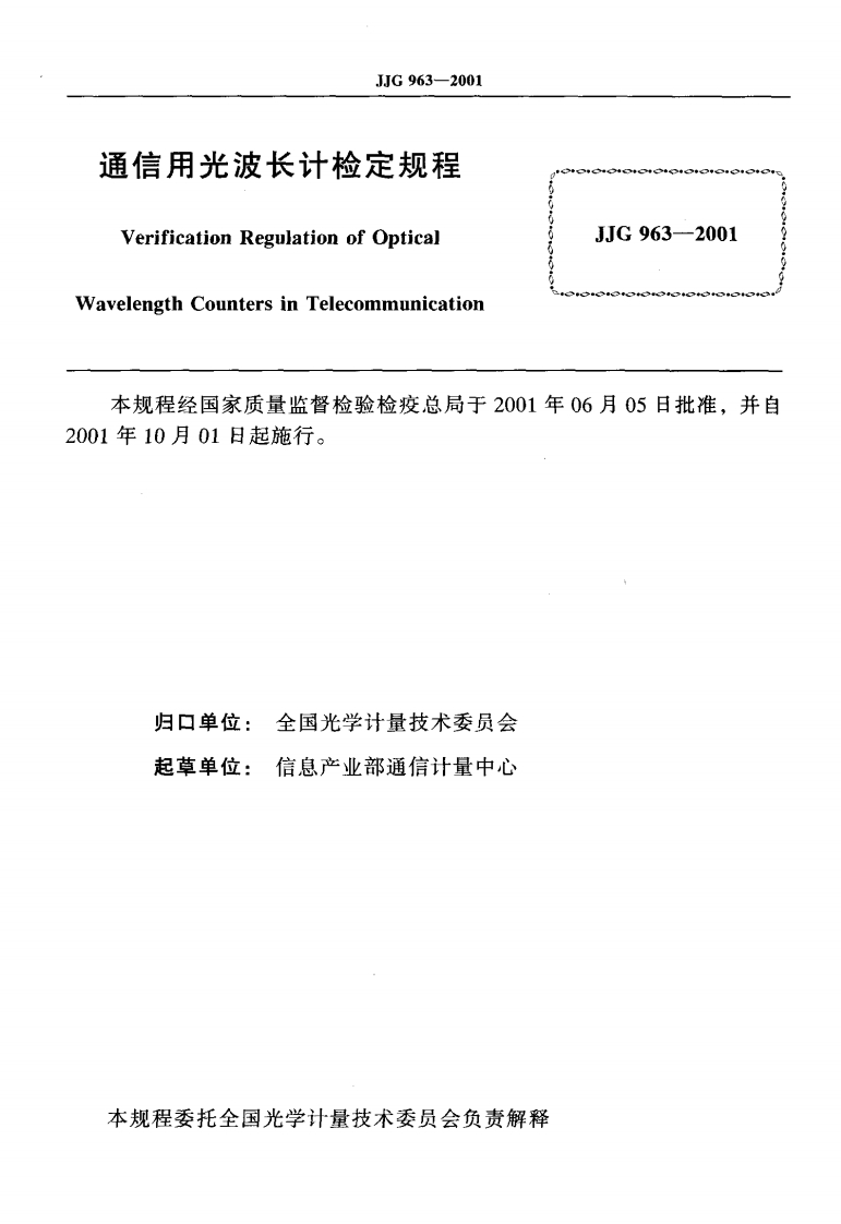 JJG963-2001通信用光波长计348072@abc4个月前发布关注私信0.18MB11页042JJG963-2001通信用光波长计此内容为付费资源,请付费后查看¥13¥23黄金会员免费钻石会员免费立即购买您当前未登录!建议登陆后购买,可保存购买订单付费资源 第1页 / 共11页 第2页 / 共11页 试读已结束,还剩9页,您可下载完整版后进行离线阅读 THE END标准规范 文本预览 灯G中华人民共和国国家计量检定规程JJG963-2001通信用光波长计Optical Wavelength Counters in Telecommunication2001-06-05发布2001-10-01实施国家质量监督检验检疫总局发布 查看更多 收起部分 喜欢就支持一下吧收藏