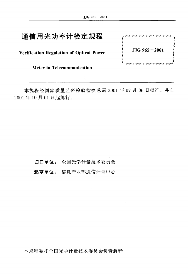 JJG965-2001通信用光功率计348072@abc4个月前发布关注私信0.30MB15页049JJG965-2001通信用光功率计此内容为付费资源,请付费后查看¥13¥23黄金会员免费钻石会员免费立即购买您当前未登录!建议登陆后购买,可保存购买订单付费资源 第1页 / 共15页 第2页 / 共15页 试读已结束,还剩13页,您可下载完整版后进行离线阅读 THE END标准规范 文本预览 寸G中华人民共和国国家计量检定规程JJG965-2001通信用光功率计Optical Power Meter in Telecommunication2001-07-06发布2001一10-01实施国家质量监督检验检疫总局发布 查看更多 收起部分 喜欢就支持一下吧收藏