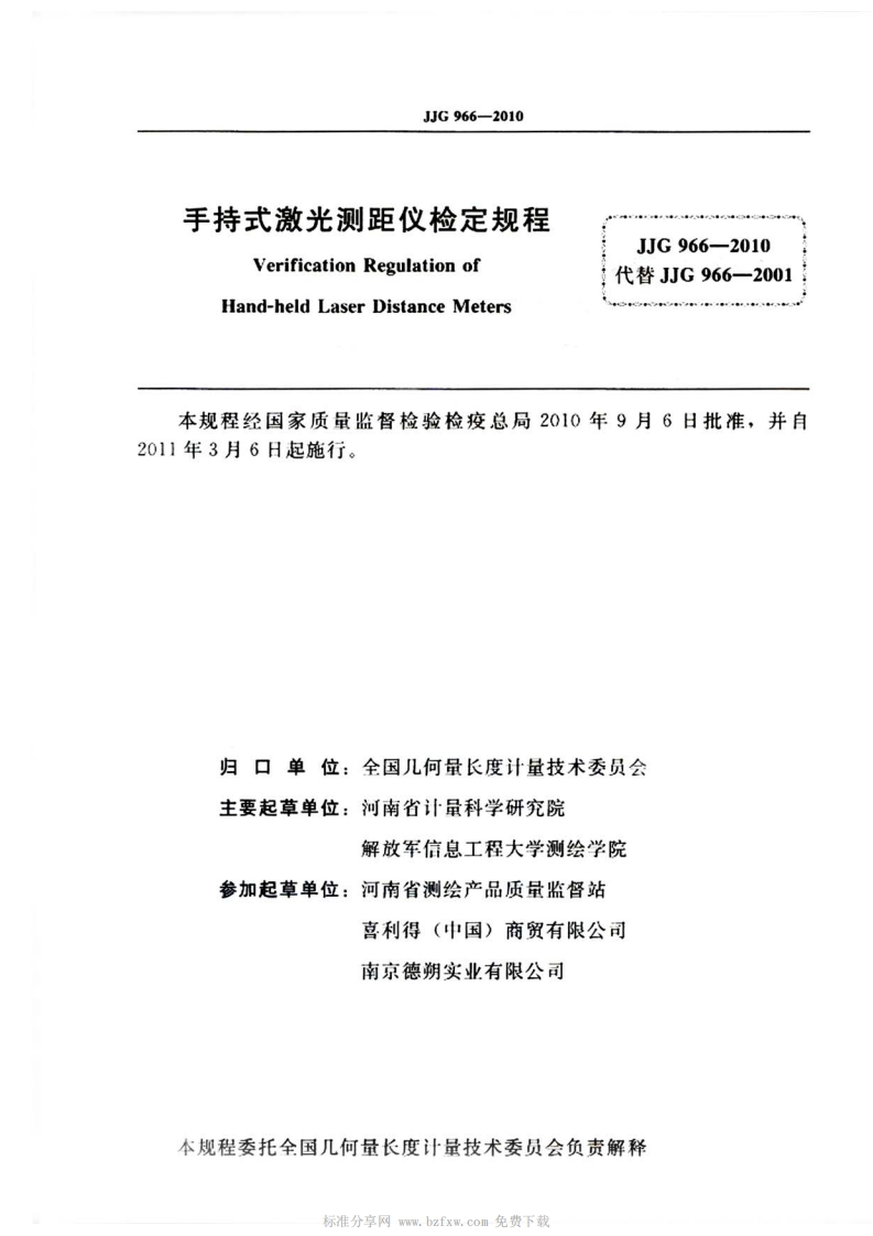 JJG966-2010手持式激光测距仪检定规程348072@abc4个月前发布关注私信2.33MB12页024JJG966-2010手持式激光测距仪检定规程此内容为付费资源,请付费后查看¥13¥23黄金会员免费钻石会员免费立即购买您当前未登录!建议登陆后购买,可保存购买订单付费资源 第1页 / 共12页 第2页 / 共12页 试读已结束,还剩10页,您可下载完整版后进行离线阅读 THE END标准规范 文本预览 可可G中华人民共和国国家计量检定规程JJG966-2010代替JJG966一2001手持式激光测距仪检定规程Verification Regulation ofHand-held Laser Distance Meters2010-09-06发布2011-03-06实施国家质量监督检验检疫总局发布 查看更多 收起部分 喜欢就支持一下吧收藏