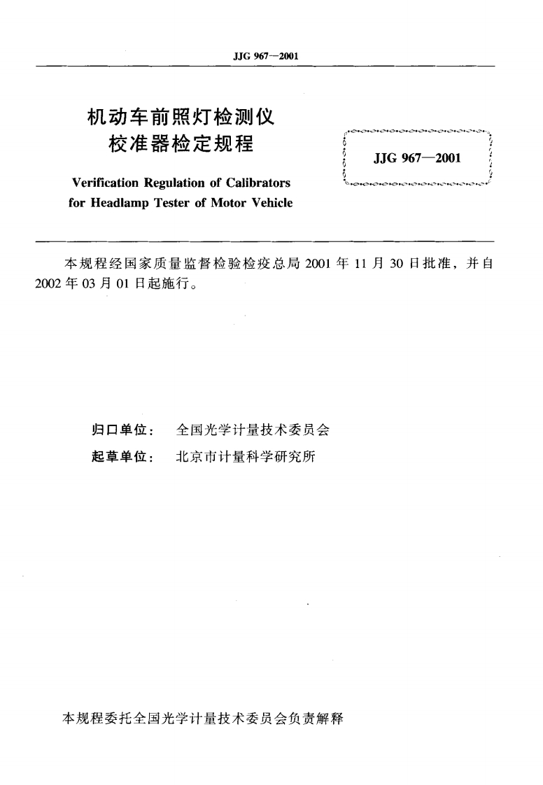 JJG967-2001机动车前照灯检测仪校准器348072@abc4个月前发布关注私信0.46MB18页039JJG967-2001机动车前照灯检测仪校准器此内容为付费资源,请付费后查看¥13¥23黄金会员免费钻石会员免费立即购买您当前未登录!建议登陆后购买,可保存购买订单付费资源 第1页 / 共18页 第2页 / 共18页 试读已结束,还剩16页,您可下载完整版后进行离线阅读 THE END标准规范 文本预览 可可G中华人民共和国国家计量检定规程JJG967一2001机动车前照灯检测仪校准器Calibrators for Headlamp Tester of Motor Vehicle2001-11-30发布2002-03-01实施国家质量监督检验检疫总局发布 查看更多 收起部分 喜欢就支持一下吧收藏