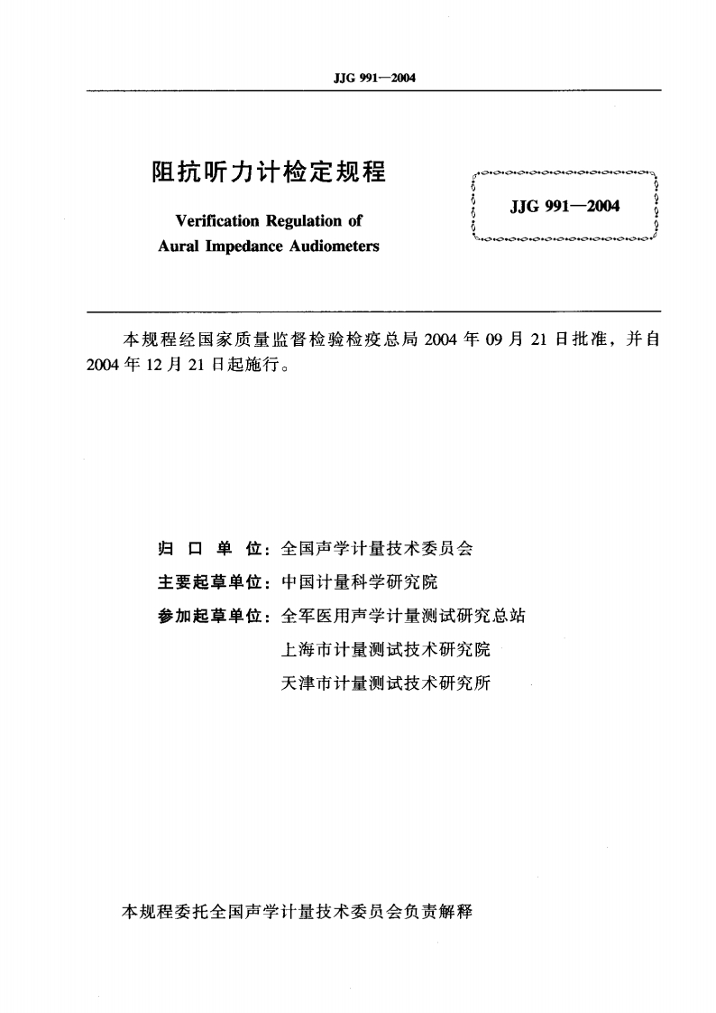 JJG991-2004阻抗听力计348072@abc4个月前发布关注私信0.56MB23页029JJG991-2004阻抗听力计此内容为付费资源,请付费后查看¥13¥23黄金会员免费钻石会员免费立即购买您当前未登录!建议登陆后购买,可保存购买订单付费资源 第1页 / 共23页 第2页 / 共23页 试读已结束,还剩21页,您可下载完整版后进行离线阅读 THE END标准规范 文本预览 河G中华人民共和国国家计量检定规程JJG991一2004阻抗听力计Aural Impedance Audiometers2004-09-21发布2004-12-21实施国家质量监督检验检疫总局发布 查看更多 收起部分 喜欢就支持一下吧收藏