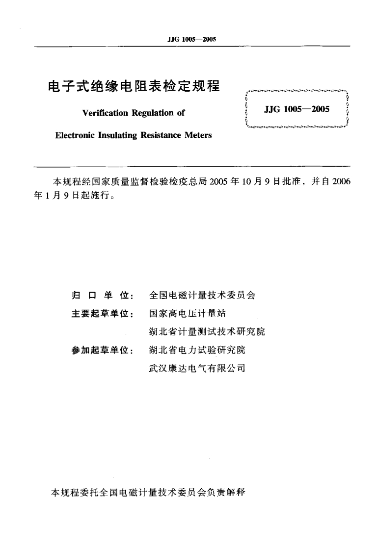 JJG1005-2005电子式绝缘电阻表348072@abc4个月前发布关注私信0.24MB14页046JJG1005-2005电子式绝缘电阻表此内容为付费资源,请付费后查看¥13¥23黄金会员免费钻石会员免费立即购买您当前未登录!建议登陆后购买,可保存购买订单付费资源 第1页 / 共14页 第2页 / 共14页 试读已结束,还剩12页,您可下载完整版后进行离线阅读 THE END标准规范 文本预览 可G中华人民共和国国家计量检定规程JJG1005一2005电子式绝缘电阻表Electronic Insulating Resistance Meters2005-10-09发布2006-01-09实施国家质量监督检验检疫总局发布 查看更多 收起部分 喜欢就支持一下吧收藏