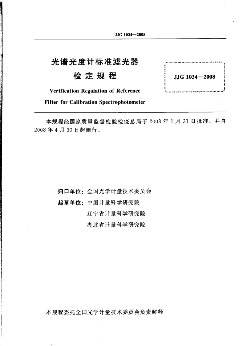 JJG1034-2008光谱光度计标准滤光器348072@abc4个月前发布关注私信10.83MB27页041JJG1034-2008光谱光度计标准滤光器此内容为付费资源,请付费后查看¥13¥23黄金会员免费钻石会员免费立即购买您当前未登录!建议登陆后购买,可保存购买订单付费资源 第1页 / 共27页 第2页 / 共27页 试读已结束,还剩25页,您可下载完整版后进行离线阅读 THE END标准规范 文本预览 可g中华人民共和国国家计量检定规程JJG1034-008光谱光度计标准滤光器Reference Filter for Calibration Spectrophotometer2008=01-31发布2008-04-30实施国家质量监督检验检疫总局发布 查看更多 收起部分 喜欢就支持一下吧收藏
