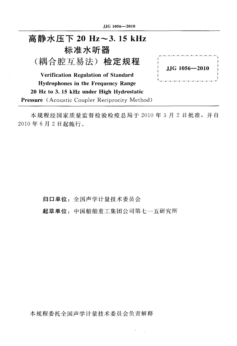 可而G中华人民共和国国家计量检定规程JJG1056-2010高静水压下20Hz~3.15kHz标准水听器(耦合腔互易法)Standard Hydrophones in the Frequency Range 20 Hz to 3.15 kHzunder High Hydrostatic Pressure (Acoustic Coupler Reciprocity Method)2010-03-02发布2010-06-02实施国家质量监督检验检疫总局发布