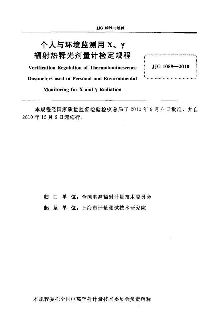 JJG1059-2010个人与环境监测用X、γ辐射热释光剂量计348072@abc2个月前发布关注私信0.34MB19页03815JJG1059-2010个人与环境监测用X、γ辐射热释光剂量计此内容为付费资源,请付费后查看¥13¥23黄金会员免费钻石会员免费立即购买您当前未登录!建议登陆后购买,可保存购买订单付费资源 第1页 / 共19页 第2页 / 共19页 试读已结束,还剩17页,您可下载完整版后进行离线阅读 © 版权声明文章版权归作者所有,未经允许请勿转载。THE END标准规范 文本预览 J而G中华人民共和国国家计量检定规程JJG1059-2010个人与环境监测用X、Y辐射热释光剂量计Thermoluminescence Dosimeters used in Personaland Environmental Monitoring for X and y Radiation2010-09-06发布2010-12-06实施国家质量监督检验检疫总局发布 查看更多 收起部分 喜欢就支持一下吧点赞15 分享QQ空间微博QQ好友海报分享复制链接收藏