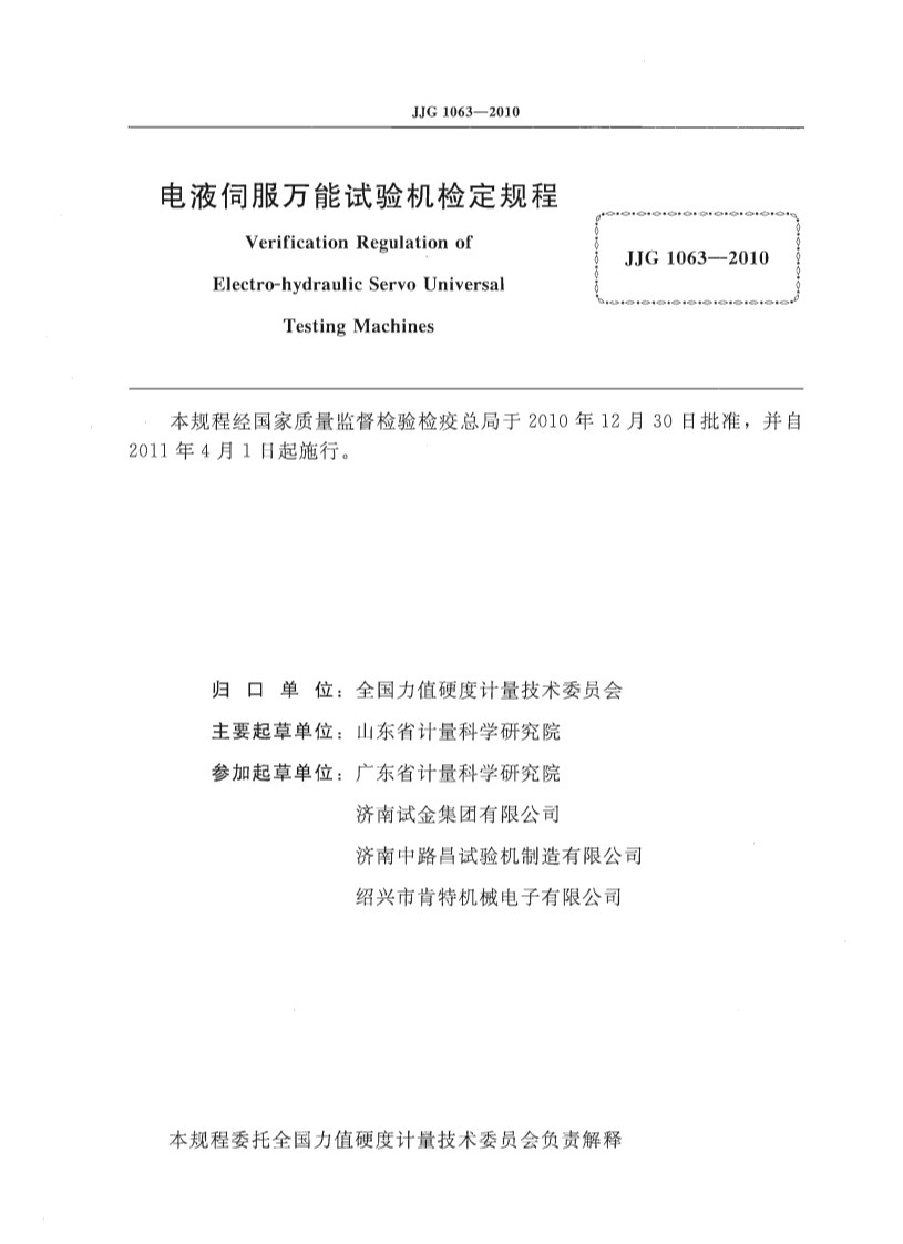JJG1063-2010电液伺服万能试验机348072@abc2个月前发布关注私信0.61MB18页0488JJG1063-2010电液伺服万能试验机此内容为付费资源,请付费后查看¥13¥23黄金会员免费钻石会员免费立即购买您当前未登录!建议登陆后购买,可保存购买订单付费资源 第1页 / 共18页 第2页 / 共18页 试读已结束,还剩16页,您可下载完整版后进行离线阅读 © 版权声明文章版权归作者所有,未经允许请勿转载。THE END标准规范 文本预览 计量论坛WWW.GFJL.ORG可可G中华人民共和国国家计量检定规程JJG1063-2010电液伺服万能试验机Electro-hydraulic Servo UniversalTesting Machines2010-12-30发布2011-04-01实施国家质量监督检验检疫总局发布数的 查看更多 收起部分 喜欢就支持一下吧点赞8 分享QQ空间微博QQ好友海报分享复制链接收藏