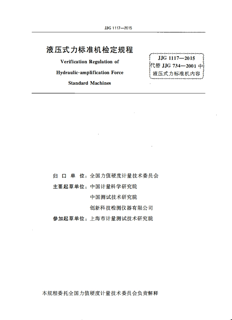 JJG1117-2015液压式力标准机检定规程348072@abc2个月前发布关注私信2.09MB15页03611JJG1117-2015液压式力标准机检定规程此内容为付费资源,请付费后查看¥13¥23黄金会员免费钻石会员免费立即购买您当前未登录!建议登陆后购买,可保存购买订单付费资源 第1页 / 共15页 第2页 / 共15页 试读已结束,还剩13页,您可下载完整版后进行离线阅读 © 版权声明文章版权归作者所有,未经允许请勿转载。THE END标准规范 文本预览 可可G中华人民共和国国家计量检定规程JJG1117-2015液压式力标准机Hydraulic-amplification Force Standard MachinesHT6012015-06-15发布2015-12-15实施国家质量监督检验检疫总局发布 查看更多 收起部分 喜欢就支持一下吧点赞11 分享QQ空间微博QQ好友海报分享复制链接收藏