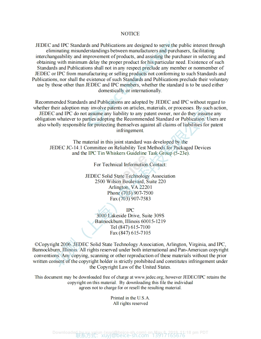 JEDECIPCJOINT PUBLICATIONCurrent Tin Whiskers Theory andMitigation Practices GuidelineJP002学有MARCH 2006海)JEDEC SOLID STATE TECHNOLOGY ASSOCIATIONIPC ASSOCIATION CONNECTING ELECTRONICS INDUSTRIESJE五ECIPCASSOCIATION CONNECTINGELECTRONICS INDUSTRIESDownloade联系芳x@b81是h0nm13765品7618pmPp7