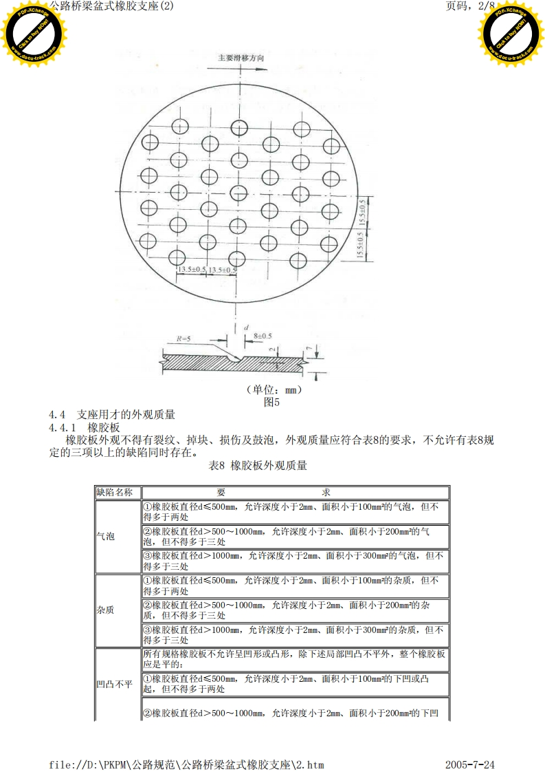 公路桥梁盆式橡胶支座(2)页码,1/8cu-trsck公路工程公路桥梁盆式橡胶支座(2)表6橡胶板偏差橡胶板直径(mm)直径偏差(mm)厚度偏差(mm)≤500+0.5+2.000>5001000+1.0+2.500+3.0>10001500+1.500+2.0+5.0>1500004.3.2聚四氟乙烯板活动支座用聚四氟乙烯板的设计允许压应力为30MPa。聚四氟乙烯板的尺寸偏差应符合表7的规定。支座装配时聚四氟乙烯板和嵌放它的凹槽之间的缝隙不得大于0.5mm或聚四氟乙烯板公称直径的0.1%。聚四氟乙烯板的生产厂可按设计直径及偏差要求适当考虑加工余量。表7聚四氟乙烯板的尺寸偏差直径(mm)直径或长度偏差(m)厚度偏差(mm)+1.50.5≤50000>500-1200+2.00.7500>1200+3.0+1.000聚四氟乙烯板的滑动面上应设有存放5201-2硅脂的储脂槽,储脂槽不能用机械方法成形。储脂槽的平面布置和尺寸见图5。file://D:PKPM公路规范公路桥梁盆式橡胶支座2.htm2005-7-24