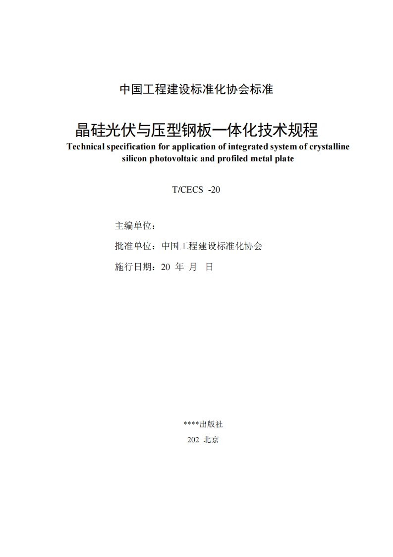 中国工程建设标准化协会标准晶硅光伏与压型钢板一体化技术规程Technicalspecificationforcrystallinesiliconphotovoltaicsystemintegratedprofiledsteel(征求意见稿)348072@abc29天前发布关注私信1.17MB55页033中国工程建设标准化协会标准晶硅光伏与压型钢板一体化技术规程Technicalspecificationforcrystallinesiliconphotovoltaicsystemintegratedprofiledsteel(征求意见稿)此内容为付费资源,请付费后查看¥19¥26黄金会员免费钻石会员免费立即购买您当前未登录!建议登陆后购买,可保存购买订单付费资源 第1页 / 共55页 第2页 / 共55页 试读已结束,还剩53页,您可下载完整版后进行离线阅读 THE END标准规范 喜欢就支持一下吧收藏