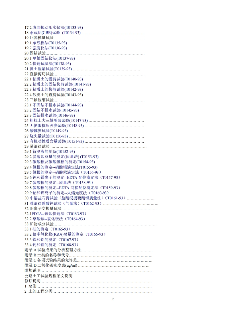 JTJ-051-93)公路土工试验规程目录目录前言.1总则.2土的工程分类(M0101-93)2.1一般规定2.2巨粒土分类2.3粗粒土分类2.4细粒土分类2.5特殊土分类2.6土的简易鉴别、分类和描述3土样的采集、运输和保管(T0101-93)4土样和试样制备(T0102-93),…………………………………5含水量试验5.1烘干法(T0103-93)5.2酒精燃烧法(T0104-93)5.3比重法(T0105-93)5.4碳化钙气压法(T0106-93)6密度试验.....6.1环刀法(T0107-93)6.2电动取土器法(T0108-93)6.3蜡封法(T0109-93)6.4灌水法(T0110-93)6.5灌砂法(T0111-93)7比重试验.……7.1比重瓶法(T0112-93)7.2浮称法(T0113-93)7.3虹吸筒法(T0114-93)8颗粒分析试验....8.1筛分法(T0115-93)8.2比重计法(T0116-93)8.3移液管法(T0117-93)9界限含水量试验…9.1液限塑限联合测定法(T0118-93)9.2滚搓法塑限试验(T0119-93)9.3缩限试验(T0120-93)】10收缩试验(T0121-93)....11天然稠度试验(T0122-93)44g9,,94,9,,9,,94,9,,9,9,,94,12砂的相对密实度试验(T0123-93)13膨胀试验.……13.1自由膨胀率试验(T0124-93)13.2无荷载膨张量试验(T0125-93)13.3有荷载膨胀量试验(T0126-93)13.4膨胀力试验(T0127-93)14毛细管水上升高度试验(T0128-93)…...…15渗透试验......15.1常水头渗透试验(T0129-93)15.2变水头渗透试验(T0130-93)16击实试验(T0131-93).…17粗粒土和巨粒土最大干密度试验………17.1振动台法(T0132-93)