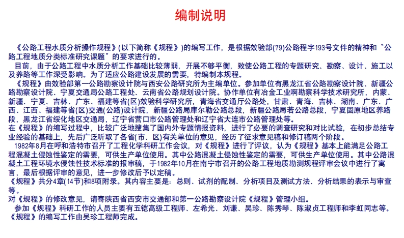 关于颁发《公路工程水质分析操作规程》的通知(不另行文)(84)交公路字2538号兹批准《公路工程水质分析操作规程》,编号JTJ056-84,作为效验部部颁标准,自1985年5月1日起实行。有关本规程的解释工作,由我部第一公路勘察设计院负责。希各有关单位在实践中注意积累资料,不断总结经验,将发现的问题和修改的意见函告效验部第一公路勘察设计院(西安市),以便修订时参考。中华人民共和国交通部一九八四年十二月二十七日