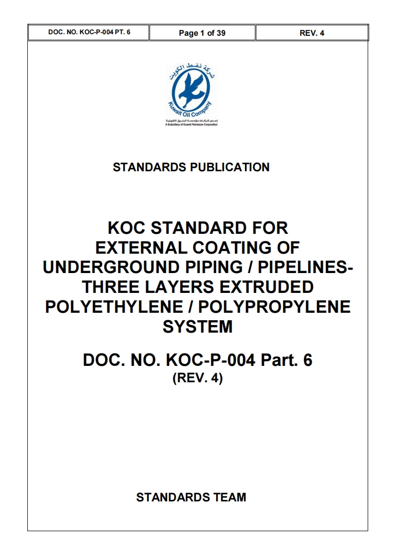 ”≥今5%下一2a≤大4NUwait oil CompanyI小w+Lm4e5sA Subsidiary of Kuwait Petroleum CorporationSTANDARDS PUBLICATIONKOC STANDARD FOREXTERNAL COATING OFUNDERGROUND PIPING/PIPELINES-PART 6:THREE LAYERS EXTRUDEDPOLYETHYLENE/POLYPROPYLENESYSTEMDOC.NO.KOC-P-004 PART 6(Rev.4)STANDARDS TEAM