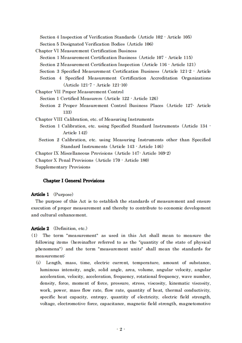 二D計量法)翻訳法平成十八年法律第十号まcD改正(平成18年4月1日施行)二○V、℃「法合用語日英標潍对訳辞者(平成19年3月版)C準趣L℃作成L大花)℃寸。在粉、二D法合D翻歆住公定歆℃仕杨)主世人。法的劾力在有寸石D法日本語D法合自体℃杨)、翻訳仕海<主℃之D理解在助忖石大的D参考资料C寸。二D翻肌)利用仁伴∽℃凳生L大問題亿∽℃、一切D責任花負力小力主寸DC、法律上D問題仁阴L℃住、官報亿揭載这九大日本語)法合在参照L℃<龙这。This English translation of the Measurement Act has been prepared (up to the revisions of Act No10 of 2006 (Effective April 1,2006))in compliance with the Standard Bilingual Dictionary March2007 edition.This is an unofficial translation.Only the original Japanese texts of laws andregulations have legal effect,and the translations are to be used solely as reference material to aid inthe understanding of Japanese laws and regulations.The Government of Japan shall not beresponsible for the accuracy,reliability or currency of the legislative material provided in this Website.or for any consequence resulting from use of the information in this Website.For all purposes ofinterpreting and applying law to any legal issue or dispute,users should consult the original Japanesetexts published in the Official Gazette.Measurement Act (Act No.51 of May 20,1992)The entirety of the Measurement Act (Act No.207 of 1951)shall be revisedChapter I General Provisions (Article 1 Article 2)Chapter II Measurement Units (Article 3Article 9)Chapter III Execution of Proper MeasurementSection 1 Accurate Measurement (Article 10)Section 2 Measurement pertaining to Sale of Commodities (Article 11.Article15)Section 3 Use of Measuring instruments (Article 16-Article 18)Section 4 Periodic Inspection (Article 19-Article 25)Section 5 Designated Periodic Inspection Bodies (Article 26-Article 39)Chapter IV Supply of Accurate Specified Measuring instrumentsSection 1 Manufacture (Article 40-Article 45)Section 2 Repair (Article 46-Article 50)Section 3 Sale (Article 51-Article 52)Section 4 Special Measuring Instruments (Article 53-Article 57)Section 5 Business of Manufacturing Special Containers (Article 58-Article 69)Chapter V Verification,etc.Section 1 Verification,Inspection of Electric Meter with Transformer and FittingInspection (Article 70-Article 75)Section 2 Type Approval (Article 76-Article 89)Section 3 Designated Manufacturing Business Operators (Article 90-Article101)1-