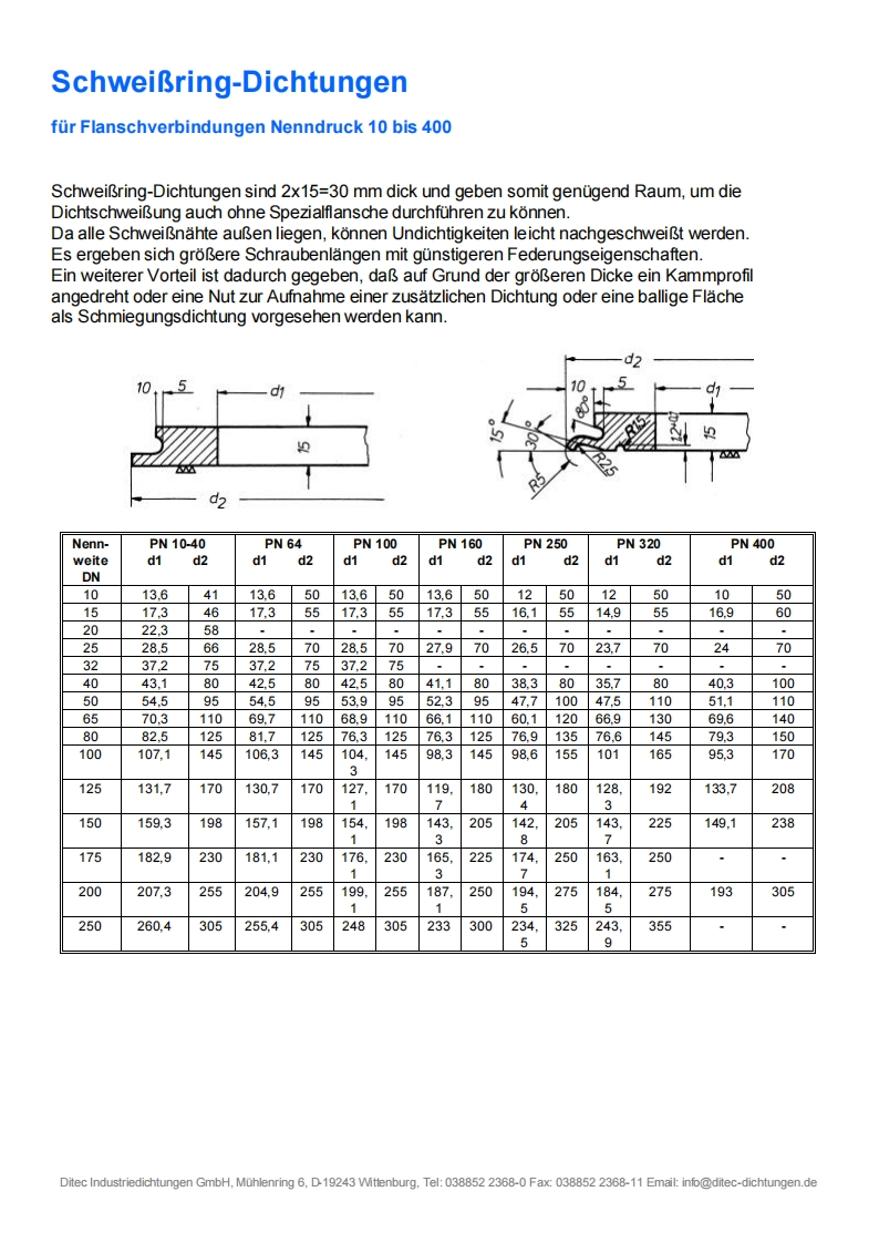 Membran-SchweiBdichtungnach DIN 2695Uberall dort wo es darauf ankommt,einerseits wegen der Gefahrlichkeit des Mediums oderder Gefahr einer Betriebsunterbrechung eine absolute Dichtverbindung herzustellen,andererseits aber eine bedingte Losbarkeit der Verbindung erhalten bleiben muB,empfehlenwir den Einsatz von SchweiBdichtungen.Bei der Flansch-und Schraubenberechnung ist durch entsprechende Zuschlage dafur zusorgen,daBs beide Schweighalften immer Spaltfrei aufeinanderliegen.Membran-Dichtringe nach DIN 2695 sind je 4 mm dick und kommen in der Regel nurpaarweise zum Einsatz.Sie werden in der Regel aus dem gleichen oder einen naheverwandtenWerkstoff wie Rohr oder Flansch gefertigt.Diese Dichtungen werdenzuerst innen angeschweift und spater auBen verschweilt.Die SchweiBungen sind alsDichtschweifungen auszufuhren.d3Die SchwelBungender Dichtringe sindals DichtschweiBungenZ/=V/Rt=16auszufohren.DNd1d2d364100160250/3204008090143149153123100115169176179149125142206213216186150165243248218175190273280283253200214305315285250264360370340300310420430400350340482490460400386539519Ditec Industriedichtungen GmbH,Mohlenring 6,D19243 Wittenburg.Tel:038852 2368-0 Fax:038852 2368-11 Email:info@ditec-dichtungen.de