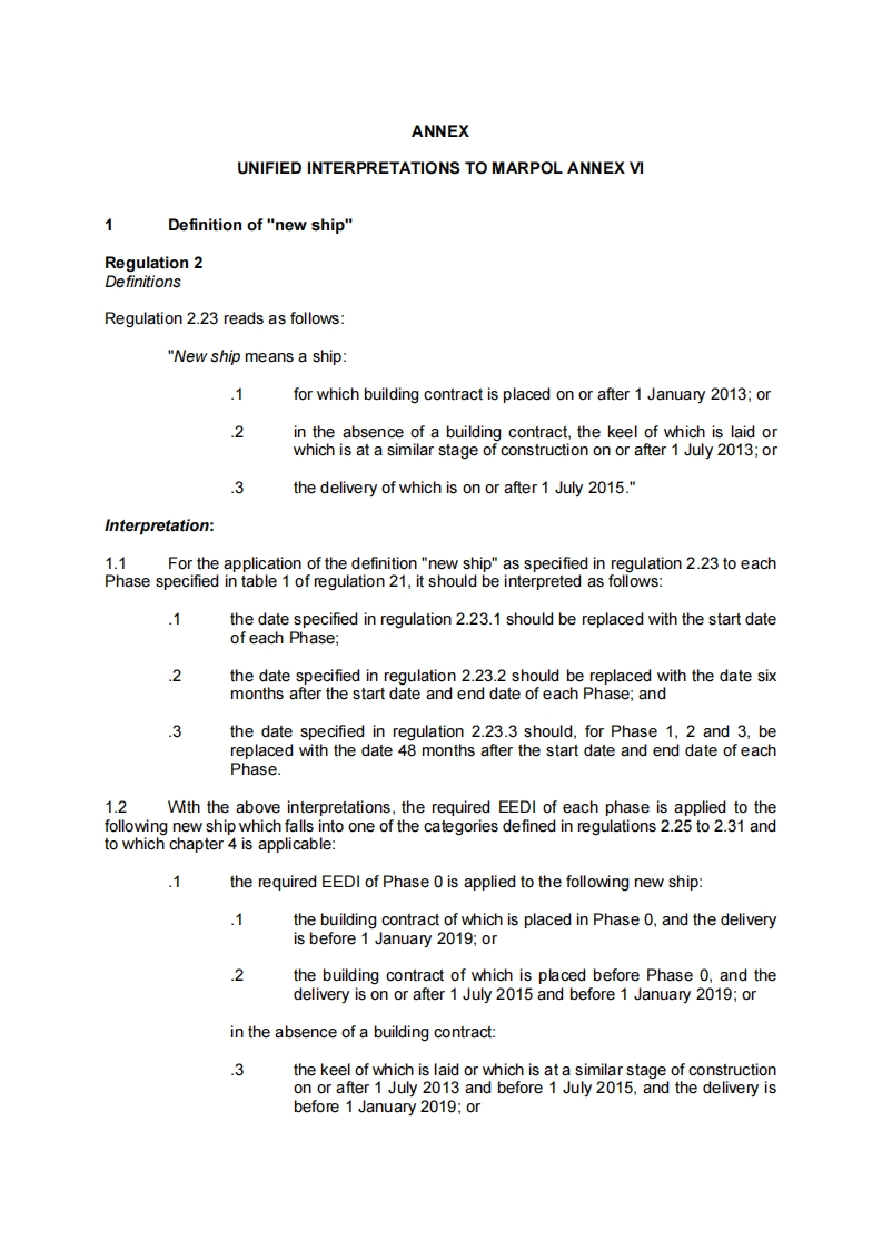 MEPC.1/Circ.795/Rev.58 July 2021UNIFIED INTERPRETATIONS TO MARPOL ANNEX VI1 The Marine Environment Protection Committee,at its seventy-sixth session(10 to 17 June 2021),approved unified interpretations to regulation 2.23 of MARPOL Annex VIconcerning the clarification of the dates related to EEDI Phase 2 and 3 for new ships.2 The updated consolidated text of all existing unified interpretations toMARPOL Annex VI,including those set out in circular MEPC.1/Circ.795/Rev.4,are set out inthe annex.3 Member Governments are invited to apply the annexed unified interpretations toMARPOL Annex VI,as appropriate,and bring them to the attention of all Parties concerned.This circular revokes MEPC.1/Circ.795/Rev.4.