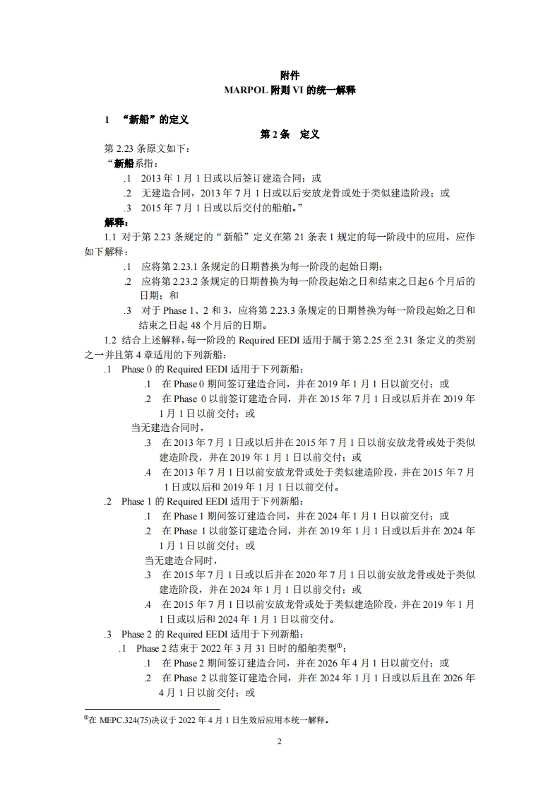 MEPC.1/Circ.795/Rew.5通函(2021年7月8日)MARPOL附则VI的统一解释1海上环境保护委员会在其第76届会议(2021年6月10日至17日)上批准了MARPOL附则VⅥ第2.23条,关于新船EEDI的第2和3阶段日期澄清的统一解释。2经更新的MARPOL附则VⅥ所有现有统一解释的综合文本,包括MEPC.1/Circ.795Rev.4通函所载的统一解释,载于附件。3请各成员国政府视具体情况应用附件中的《MARPOL附则VⅥ的统一解释》,并使所有相关方注意到附件中的统一解释。4本通函替代MEPC.1Circ.795/Rev4.