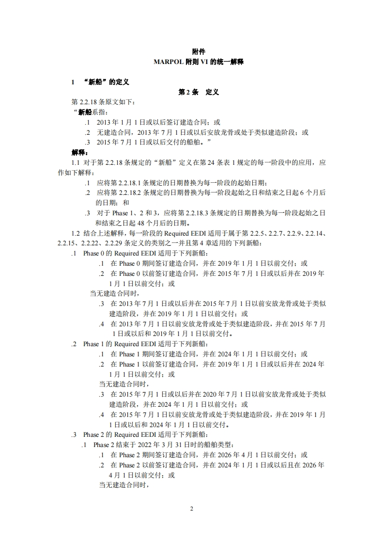 环保会MEPC.1/Circ.795/Rev.7通函(2022年12月16日)MARPOL附则VI的统一解释1海上环境保护委员会在其第79届会议(2022年12月12日至16日)上批准了MARPOL附则VI的统一解释,包括:.1扩展MARPOL附则VI第18.3条关于生物燃料和合成燃料应用的统一解释的范围:.2澄清在IMO数据收集系统(IMO DCS)中报告船上消耗的蒸发气体(BOG):.3澄清MARPOL附则VI第22.3条中EEDI的报告要求.4有关制定和验证SEEMP和签发报告CⅡ的符合声明的事宜:2经更新的MARPOL附则VI所有现有统一解释的综合文本,包括MEPC.1/Circ.795/Rev.6通函所载的统一解释,载于附件。3所附统一解释的条文编号参见MEPC.328(76)决议通过的《2021年经修订的MARPOL附则VI》,其于2022年11月1日生效。4请各成员国政府视具体情况应用附件中的《MARPOL附则VI的统一解释》,并使所有相关方注意到附件中的统一解释。5还请各成员国政府注意MEPC.1/Circ.897通函,通函中列出了《2021年经修订的MARPOL附则VI》和之前MARPOL附则VI之间的交叉索引表.6本通函替代MEP℃.1/Circ.795/Rev.6.