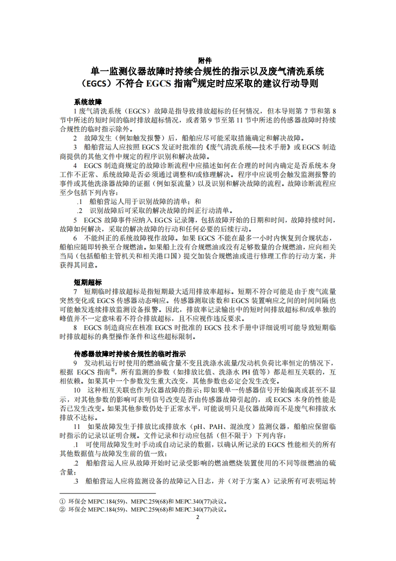 环保会MEPC.1/Circ.883/Rev.1通函(2021年12月15日)单一监测仪器故障时持续合规性的指示以及废气清洗系统(EGCS)不符合EGCS指南规定时应采取的建议行动导则1海上环境保护委员会在其第74届会议(2019年5月13日至17日)上,批准了《一监测仪器故障时持续合规性的指示以及废气清洗系统(EGCS)不符合2015EGCS指南(MEPC.259(68)决议)规定时应采取的建议行动导则》(环保会MEPC.1/Circ.883通函)。2海上环境保护委员会在其第77届会议(2021年11月22日至26日)上,通过环保会MEP℃.340(77)决议《2021年废气清洗系统指南(2021EGCS指南)》。3认识到有必要扩大环保会MEP℃.1/Cic.883通函的范围至也包括按照环保会MEPC.184(59)决议《2009EGCS指南》和环保会MEPC.340(77)决议《2021EGCS指南》安装的EGCS,MEPC77批准了《单一监测仪器故障时持续合规性的指示以及废气清洗系统(EGCS)不符合EGCS指南规定时应采取的建议行动导则》,其文本载于附件。4提请各成员国政府使主管机关、港口国控制当局、行业、相关航运组织、航运公司和其他利益相关方注意附件中的导则。5本通函废除环保会MEP℃.1/Circ.883通函。