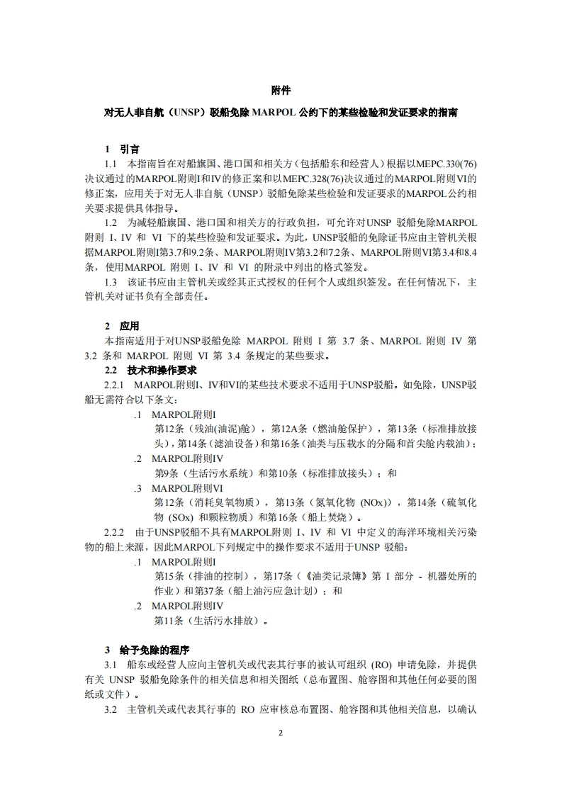 环保会MEPC.1/Circ.892通函(2021年7月9日)对无人非自航(UNSP)驳船免除MARPOL公约下某些检验和发证要求的指南1海上环境保护委员会在其第76届会议(2021年6月10日至17日)上,分别以MEPC.330(76)和MEPC.328(76)决议通过了关于对无人非自航(UNSP)驳船免除某些检验和发证要求的MARPOL附则I和IV的修正案和MARPOL附则VI的修正案.2为了对上述修正案的应用提供更具体的指导,海上环境保护委员会在其第76届会议上批准了《对无人非自航(UNSP)驳船免除MARPOL公约下的某些检验和发证要求的指南》,其文本载于附件。3请各成员国政府在对UNSP驳船免除MARPOL公约的相关规定时使用所附的指南,并使所有相关方注意本指南。y