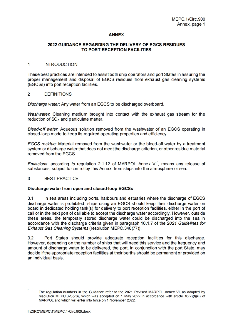 INTERNATIONALEMARITIMEORGANIZATION4 ALBERT EMBANKMENTLONDON SE1 7SRTelephone:+44(0)2077357611Fax:+44(0)2075873210MEPC.1/Circ.90010June20222022 GUIDANCE REGARDING THE DELIVERY OF EGCS RESIDUES TO PORTRECEPTION FACILITIES1 The Marine Environment Protection Committee,at its seventy-eighth session(6 to 10 June 2022),approved the 2022 Guidance regarding the delivery of EGCS residues toport reception facilities,as set out in the annex.2In this context,the Committee recalled that regulation 17.1.2 of MARPOL Annex VIrequires that each Party undertake to ensure the provision of facilities adequate to meet theneeds of ships using its ports,terminals or repair ports for the reception ofexhaust gas cleaningresidues from an exhaust gas cleaning system.3Member Governments are invited to bring the annexed Guidance to the attention ofAdministrations,port State authorities,industry,relevant shipping organizations,shippingcompanies and other stakeholders concerned.The Committee agreed to keep this Guidance under review in light of experiencegained.Il:CIRCMEPC1MEPC.1-Circ.900.docxEW TECHNOLOGIESGREENE⑧SHIPPING