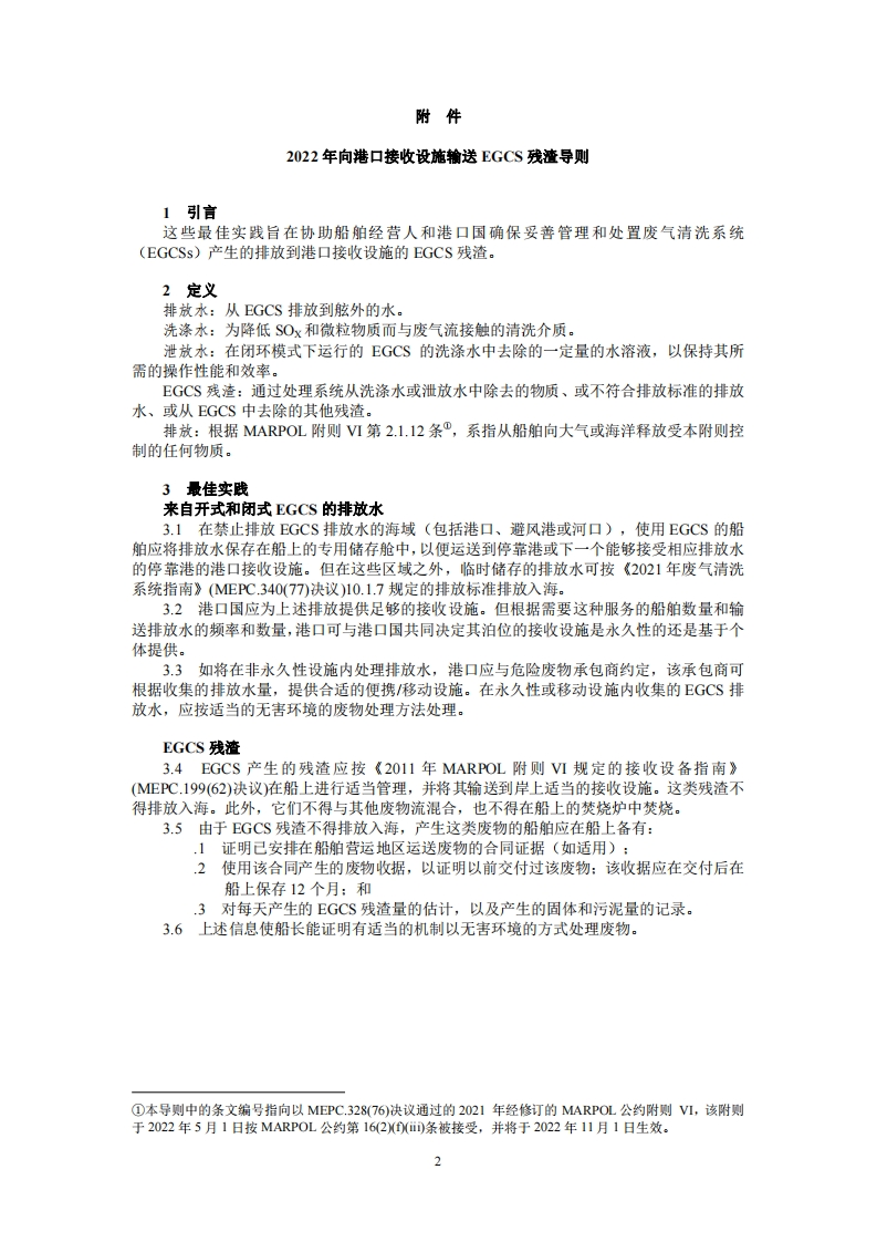 环保会MEPC.1/Circ.900通函(2022年6月10日)2022年向港口接收设施输送EGCS残渣导则1海上环境保护委员会在其第78届会议(2022年6月6日至10日)上通过了《2022年向港口接收设施输送EGCS残渣导则》,其文本载于附件。2为此,委员会忆及MARPOL附则VI第17.1.2条要求各缔约国承担义务,保证提供足够的设施以满足使用其港口、装卸站或修理港的船舶接收废气清洗系统产生的废气清洗残余物的需要。3提请各成员国政府使主管机关、相关航运组织、港口国主管当局、业界、航运公司及其他利益相关方注意到附件中的导则.4委员会同意根据所获得的经验继续审议本导则。
