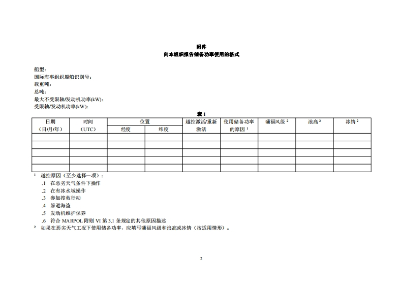 环保会MEPC.1/Circ.908通函(2024年4月25日)向本组织报告储备功率使用的格式1海上环境保护委员会在其第80届会议(2023年7月3日至7日)上以MEP℃.375(80)决议通过了《2021年为符合现有船舶能效指数(EEX①)要求采用的轴/发动机功率限制系统和储备功率使用导则》修正案,要求每年6月30日之前,主管机关应向秘书处报告在前一日历年12个月期间(1月1日至12月31日)的储备功率使用情况,报告应包含按修正后的上述导则内相关条款所记录的信总。2海上环境保护委员会在其第81届会议(2024年3月18日至22日)上,批准了《向本组织报告储备功率使用的格式》。3提请各主管机关使用本通函附件的格式,通过电子邮件向ghg@imo.og报告储备功率的使用情况(如有)。