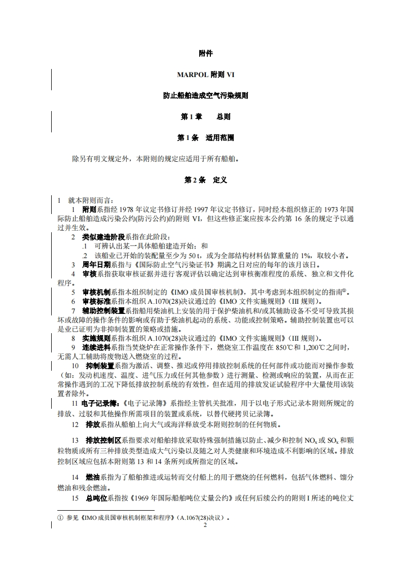 环保会MEPC.328(76)决议《经1978年议定书修订的1973年国际防止船舶造成污染公约的1997年议定书》附则修正案2021年经修订的MARPOL附则VI海上环境保护委员会,忆及国际海事组织公约第38()条关于防止和控制船舶造成海洋污染的国际公约赋予海上环境保护委员会的职能,还忆及《经1978年议定书修订的1973年国际防止船舶造成污染公约》(MARPOL)第16条,该条规定了修正程序和赋予本组织的相关机构审议和通过公约修正案的职能,进一步忆及本委员会在其第72届会议上通过了MEPC.304(72)决议《MO关于减少船舶温室气体排放的初步战略》。在其第T6届会议上,审议了提出的MARPOL附则VI关于减少国际航运碳强度的强制性基于目标的技术和营运措施和免除无人非自航(UNSP)驳船特定检验和发证要求的修正案,该修正案按MARPOL第16(2)(a)条予以分发,在其第T6届会议上,还审议了提出的MARPOL附则VⅥ修正案对各国影响的综合评估,包括对发展中国家,特别是最不发达国家(LDC)和发展中小岛国家(SDS)①的影响:1按MARPOL第16(2)条规定,通过MARPOL附则VI的修正案,其文本载于本决议附件:2按MARPOL第16(2)(f(ii条规定,决定该MARPOL附则VI修正案于2022年5月1日应视为已被接受,除非在此日期之前,有不少于三分之一的本公约缔约国政府或拥有商船合计吨位数不少于世界商船总吨数50%的缔约国通知本组织其反对该修正案:3请各缔约国政府注意,按MARPOL第16(2)(g()条规定,该MARPOL附则VI修正案在按上述2被接受后,应于2022年11月1日生效:4还请各缔约国尽快考虑并开始制定《碳强度规则》:5提请本组织根据MARPOL附则VI修正案第25.3和28.11条中规定的评审条款尽早开始相关评审:6还提请本组织保持评审上述MARPOL附则VI修正案对各国的影响,特别注意发展中国家的需求,特别是最不发达国家和发展中小岛国家,从而能采取任何必要的调整:7同意从对MARPOL附则VI修正案对各国的综合影响评估中吸取教训,以改进开展未来影响评估的程序,并考虑到《评估候选措施对各国影响的程序》(MEPC.1/Circ.885)和短期措施影响评估范围②:8鼓励各缔约国考虑尽早应用上述修正案:9要求秘书长按MARPOL第16(2)(©)条规定,将核准无误的本决议副本及附件中的MARPOL附则VI修正案文本分发给所有MARPOL缔约国政府:10还要求秘书长将本决议及其附件的副本分发给非MARPOL缔约国的本组织成员。①见MEPC76713、MEPC76NF和MEPC76NF.68/Add.1、Add.2和Add,3文件所载。②见《在MEPC76之前对短期措施进行综合影响评估的范围及安排》(MEPC7518附件6)所载。