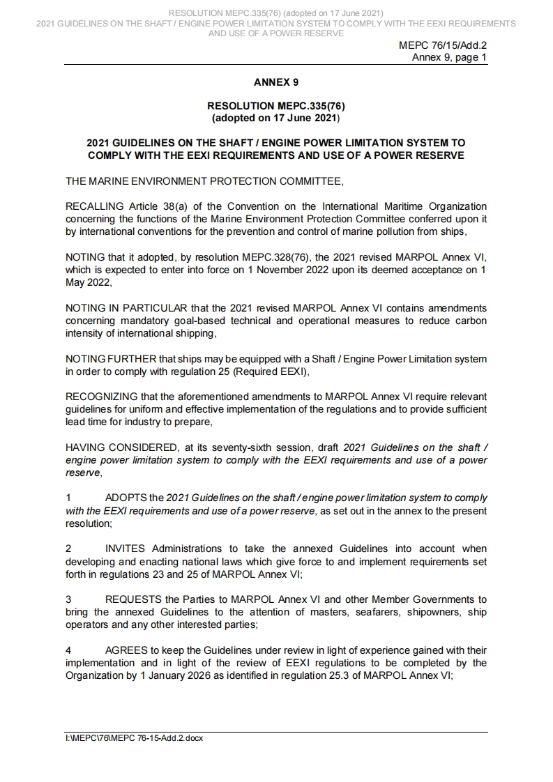 MEPC.335(76)348072@abc2个月前发布关注私信1.55MB12页04815MEPC.335(76)此内容为付费资源,请付费后查看¥17¥32黄金会员免费钻石会员免费立即购买您当前未登录!建议登陆后购买,可保存购买订单付费资源 第1页 / 共12页 第2页 / 共12页 试读已结束,还剩10页,您可下载完整版后进行离线阅读 © 版权声明文章版权归作者所有,未经允许请勿转载。THE END标准规范 文本预览 RESOLUTION MEPC.335(76)(adopted on 17 June 2021)2021 GUIDELINES ON THE SHAFT/ENGINE POWER LIMITATION SYSTEM TO COMPLY WITH THE EEXI REQUIREMENTSAND USE OF A POWER RESERVE 查看更多 收起部分 喜欢就支持一下吧点赞15 分享QQ空间微博QQ好友海报分享复制链接收藏