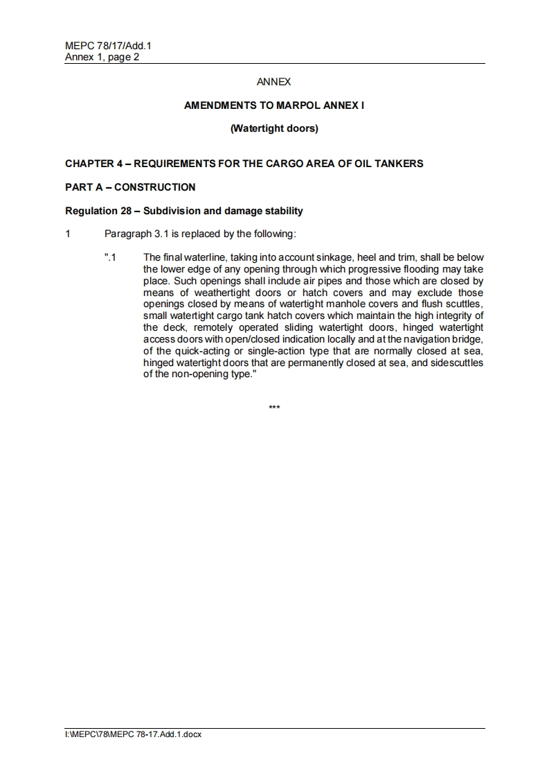 MEPC 78/17/Add.1Annex 1,page 1ANNEX 1RESOLUTION MEPC.343(78)(adopted on 10 June 2022)AMENDMENTS TO THE ANNEX OF THE INTERNATIONAL CONVENTION FOR THEPREVENTION OF POLLUTION FROM SHIPS,1973,AS MODIFIED BY THEPROTOCOL OF 1978 RELATING THERETOAmendments to MARPOL Annex IVatertight doors)】THE MARINE ENVIRONMENT PROTECTION COMMITTEE,RECALLING Article 38(a)of the Convention on the International Maritime Organizationconcerning the functions of the Marine Environment Protection Committee conferred upon itby international conventions for the prevention and control of marine pollution from ships,RECALLING ALSO article 16 of the International Convention for the Prevention of Pollutionfrom Ships,1973,as modified by the Protocol of 1978 relating thereto (MARPOL),whichspecifies the amendment procedure and confers upon the appropriate body of theOrganization the function of considering amendments thereto for adoption by the Parties,HAVING CONSIDERED,at its seventy-eighth session,proposed amendments toMARPOL Annex I concerning watertight doors,ADOPTS,in accordance with article 16(2)(d)of MARPOL,amendments toMARPOL Annex I,the text of which is set out in the annex to the present resolution;2DETERMINES,in accordance with article 16(2)(f)(iii)of MARPOL,that theamendments shall be deemed to have been accepted on 1 July 2023 unless prior to that date,not less than one-third of the Parties or Parties the combined merchant fleets of whichconstitute not less than 50 per cent of the gross tonnage of the world's merchant fleet havecommunicated to the Organization their objection to the amendments;3INVITES the Parties to note that,in accordance with article 16(2)(g)(ii)of MARPOL,the said amendments shall enter into force on 1 January 2024 upon their acceptance inaccordance with paragraph 2 above;4REQUESTS the Secretary-General,for the purposes of article 16(2)(e)of MARPOL,to transmit certified copies of the present resolution and the text of the amendments containedin the annex to all Parties to MARPOL;ALSO REQUESTS the Secretary-General to transmit copies of the present resolutionand its annex to Members of the Organization which are not Parties to MARPOL.I:MEPC78MEPC 78-17.Add.1.docx