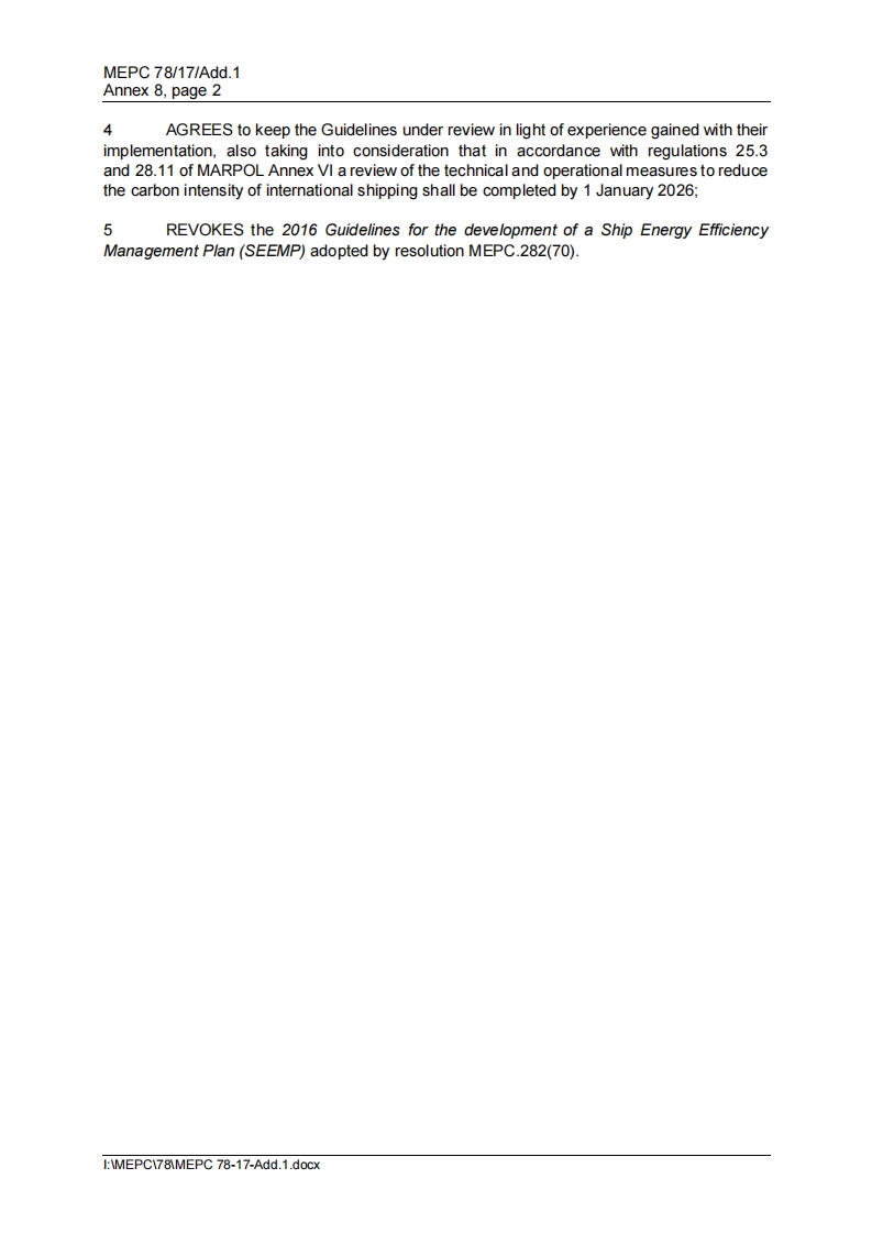 MEPC 78/17/Add.1Annex 8,page 1ANNEX 8RESOLUTION MEPC.346(78)(adopted on 10 June 2022)2022 GUIDELINES FOR THE DEVELOPMENT OF A SHIP ENERGY EFFICIENCYMANAGEMENT PLAN (SEEMP)THE MARINE ENVIRONMENT PROTECTION COMMITTEE.RECALLING Article 38(a)of the Convention on the International Maritime Organizationconcerning the functions of the Marine Environment Protection Committee (the Committee)conferred upon it by international conventions for the prevention and control of marine pollutionfrom ships,NOTING that the Committee,at its seventy-sixth session,adopted,by resolutionMEPC.328(76),the 2021 revised MARPOL Annex VI,which will enter into force on1 November 2022,NOTING IN PARTICULAR that the 2021 revised MARPOL Annex VI (MARPOL Annex V)contains amendments concerning mandatory goal-based technical and operational measuresto reduce the carbon intensity of international shipping,NOTING FURTHER that regulation 26 of MARPOL Annex VI requires each ship to keep onboard a Ship Energy Efficiency Management Plan(SEEMP),to be developed and reviewed,taking into account the guidelines adopted by the Organization,RECOGNIZING that the aforementioned amendments to MARPOL Annex VI require relevantguidelines for uniform and effective implementation of the regulations and to provide sufficientlead time for industry to prepare,NOTING that the Committee,at its seventieth session,adopted,by resolution MEPC.282(70),the 2016 Guidelines for the development of a Ship Energy Efficiency Management Plan(SEEMP).HAVING CONSIDERED,at its seventy-eighth session,the draft 2022 Guidelines for thedevelopment of a Ship Energy Efficiency Management Plan(SEEMP).ADOPTS the 2022 Guidelines for the development of a Ship Energy EfficiencyManagement Plan(SEEMP),as set out in the annex to the present resolution;2INVITES Administrations to take the annexed Guidelines into account whendeveloping and enacting national laws which give force to and implement requirements setforth in regulation 26 of MARPOL Annex VI;REQUESTS the Parties to MARPOL Annex VI and other Member Governments tobring the annexed Guidelines to the attention of masters,seafarers,shipowners,shipoperators and any other interested parties;I:MEPC78MEPC 78-17-Add.1.docx