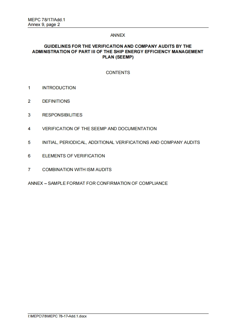 MEPC 78/17/Add.1Annex 9,page 1ANNEX 9RESOLUTION MEPC.347(78)(adopted on 10 June 2022)GUIDELINES FOR THE VERIFICATION AND COMPANY AUDITS BY THEADMINISTRATION OF PART III OF THE SHIP ENERGY EFFICIENCY MANAGEMENTPLAN(SEEMP)THE MARINE ENVIRONMENT PROTECTION COMMITTEE,RECALLING Article 38(a)of the Convention on the International Maritime Organizationconcerning the functions of the Marine Environment Protection Committee (the Committee)conferred upon it by international conventions for the prevention and control of marine pollutionfrom ships,NOTING that the Committee adopted,at its seventy-sixth session,by resolutionMEPC.328(76),the 2021 Revised MARPOL Annex VI which will enter into force on 1November 2022,NOTING IN PARTICULAR that the 2021 Revised MARPOL Annex VI(MARPOL Annex VI)contains amendments concerning mandatory goal-based technical and operational measuresto reduce carbon intensity of international shipping,NOTING FURTHER that regulation 26 of MARPOL Annex VI requires each ship to keep onboard a Ship Energy Efficiency Management Plan(SEEMP),to be developed and reviewed,taking into account the guidelines adopted by the Organization,RECOGNIZING that the aforementioned amendments to MARPOL Annex VI require relevantguidelines for uniform and effective implementation of the regulations and to provide sufficientlead time for industry to prepare,HAVING CONSIDERED,at its seventy-eighth session,draft Guidelines for the verification andcompany audits by the Administration of part lll of the Ship Energy Efficiency ManagementPlan(SEEMP),ADOPTS the Guidelines for the verification and company audits by the Administrationof part Ill of the Ship Energy Efficiency Management Plan(SEEMP),as set out in the annex tothe present resolution;2INVITES Administrations to take the annexed Guidelines into account whendeveloping and enacting national laws which give force to and implement requirements setforth in regulation 26 of MARPOL Annex VI;3REQUESTS the Parties to MARPOL Annex VI and other Member Governments tobring the annexed Guidelines to the attention of masters,seafarers,shipowners,shipoperators and any other interested parties;4AGREES to keep the Guidelines under review in light of experience gained with theirimplementation,also taking into consideration that,in accordance with regulations 25.3and 28.11 of MARPOL Annex VI,a review of the technical and operational measures to reducecarbon intensity of international shipping shall be completed by 1 January 2026.I:MEPC78MEPC 78-17-Add.1.docx