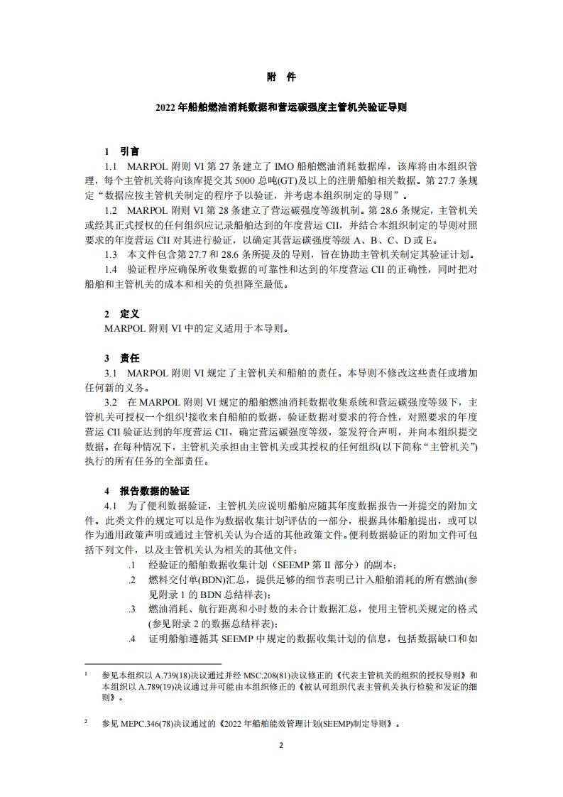 环保会MEPC.348(78)决议(2022年6月10日通过)2022年船舶燃油消耗数据和营运碳强度主管机关验证导则海上环境保护委员会,忆及《国际海事组织公约》关于防止和控制船舶造成海洋污染国际公约赋予海上环境保护委员会(本委员会)职能的第38(a)条,注意到本委员会在其第76届会议上以MEPC.328(76)决议通过的《2021年经修订的MARPOL附则VI》将于2022年11月1日生效,特别注意到《2021年经修订的MARPOL附则VI》(MARPOL附则VI)包括关于减少国际航运碳强度的强制性基于目标的技术和营运措施的修正案,还注意到MARPOL附则VⅥ第27.7条要求,船舶燃油消耗数据应按主管机关制定的程序予以验证,并考虑本组织制定的导则,进一步注意到MARPOL附则VI第28.6条规定,应记录达到的年度营运CⅡ,并结合本组织制定的导则对照要求的年度营运C对其进行验证,以确定其营运碳强度等级,认识到上述MARPOL附则VI修正案要求相关导则以统一有效地实施规则,并有足够的前置时间供业界做好准备,注意到本委员会在其第71届会议上以MEPC,292(71)决议通过的《2017年船舶燃油消耗数据主管机关验证导则》,在其第78届会议上,审议了《2022年船舶燃油消耗数据和营运碳强度主管机关验证导则》草案,1通过《2022年船舶燃油消耗数据和营运碳强度主管机关验证导则》,其文本载于本决议附件:2提请各国主管机关在制定实施和执行MARPOL附则VI第27条要求的本国法律时考虑附件中的导则:3要求MARPOL附则VI的各缔约国和其他成员国政府使船长、海员、船东、船舶经营者和任何其他相关方注意到附件中的导则:4同意根据在实施中所获得的经验对导则保持审议,还考虑到根据MARPOL附则VI第25.3和28.11条,应在2026年1月1日以前完成对减少国际航运碳强度的技术和营运措施的评审:和5废除MEPC.292(71)决议通过的《2017年船舶燃油消耗数据主管机关验证导则》。