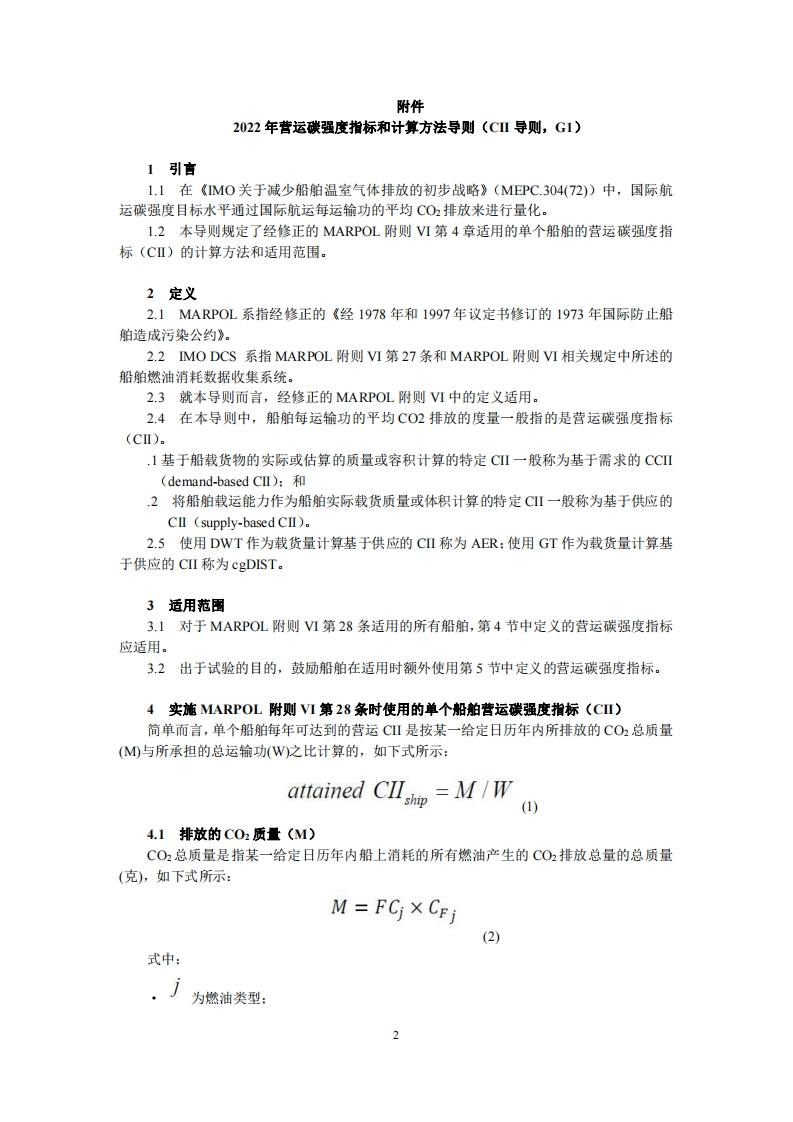 环保会MEPC.352(78)决议(2022年6月10日通过)2022年营运碳强度指标和计算方法导则(CⅡ导则,G1)海上环境保护委员会,忆及《国际海事组织公约》关于防止和控制船舶造成海洋污染国际公约赋予海上环境保护委员会(本委员会)职能的第38(a)条,注意到本委员会在其第76届会议上以M正P℃.328(76)决议通过的2021年经修订的MARPOL附则VI,将于2022年11月1日生效,特别注意到2021年经修订的MARPOL附则VI(MARPOL附则VI)包括关于减少国际航运碳强度的强制性基于目标的技术和营运措施的修正案,进一步注意到经修正的MARPOL附则VⅥ第28.1条要求对本条适用的船舶计算达到的年度营运CⅡ,并考虑到本组织制定的导则,认识到上述MARPOL附则VⅥ的修正案需要有相关导则来便于各条规则的统一和有效的实施,并为业界提供充足的提前时间进行准备,注意到本委员会在其第76届会议上以MEPC.336(76)决议通过的《2021年营运碳强度指标和计算方法导则》(CⅡ导则,G1),在其第78届会议上审议了《2022年营运碳强度指标和计算方法导则》(CⅡ导则,G1)草案,1.通过《2022年营运碳强度指标和计算方法导则》(CI导则,G1),其文本载于本决议附件:2.请主管机关在制定和颁布本国法律,以执行和实施MARPOL附则VI第28.1条要求时,考虑到附件中的导则:3.要求MARPOL附则VⅥ缔约国和其他成员国政府使船长、船员、船东、船舶经营者和任何其他利益相关方注意到附件中的导则,4.同意根据本导则实施中获得的经验,保持对本导则的评审,并考虑到按MARPOL附则VⅥ第28.11条的规定,应在2026年1月1日之前完成对减少国际航运碳强度营运措施的评审:5.废除MEPC.336(76)决议通过的《2021年营运碳强度指标和计算方法导则》(CⅡ导则,G1)。