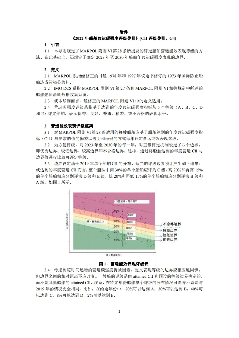 环保会MEPC.35478)决议(2022年6月10日通过)《2022年船舶营运碳强度评级导则》(CⅡ评级导则,G4)海上环境保护委员会,忆及《国际海事组织公约》关于防止和控制船舶造成海洋污染国际公约赋予海上环境保护委员会(本委员会)职能的第38(a)条,注意到体委员会以MEPC.328(76)决议通过的2021年经修订的MARPOL附则VI,将于2022年11月1日生效,特别注意到2021年经修订的MARPOL附则VI(MARPOL附则VI)包括关于减少国际航运碳强度的强制性基于目标的技术和营运措施的修正案,进一步注意到经修正的MARPOL附则VI第28.6条要求本条适用的船舶确定营运碳强度等级,并考虑到本组织制定的导则,认识到上述MARPOL附则VⅥ的修正案需要有相关导则来便于各条规则的统一和有效的实施,并为业界提供充足的提前时间进行准备,注意到本委员会在其第76届会议上以MEPC.339(76)决议通过的《2021年船舶营运碳强度评级导则》(CⅡ评级导则,G4),在其第78届会议上审议了《2022年船舶营运碳强度评级导则》(CI评级导则,G4)草案,1.通过《2022年船舶营运碳强度评级导则》(C评级导则,G4),其文本载于本决议附件:2.请主管机关在制定和颁布本国法律,以执行和实施MARPOL附则VⅥ第28.6条要求时,考虑到附件中的导则:3.要求MARPOL附则VⅥ的各缔约国和其他成员国政府使船长、船员、船东、船舶经营者和任何其他利益相关方注意到附件中的导则,4.同意根据本导则实施中获得的经验、收集和分析的额外数据,保持对本导则的评审,并考虑到按MARPOL附则VI第28.11条的规定,应在2026年1月1日之前完成对减少国际航运碳强度营运措施的评审:5.废除MEPC.339(76)决议通过的《2021年船舶营运碳强度评级导则》(CⅡ评级导则,G4).