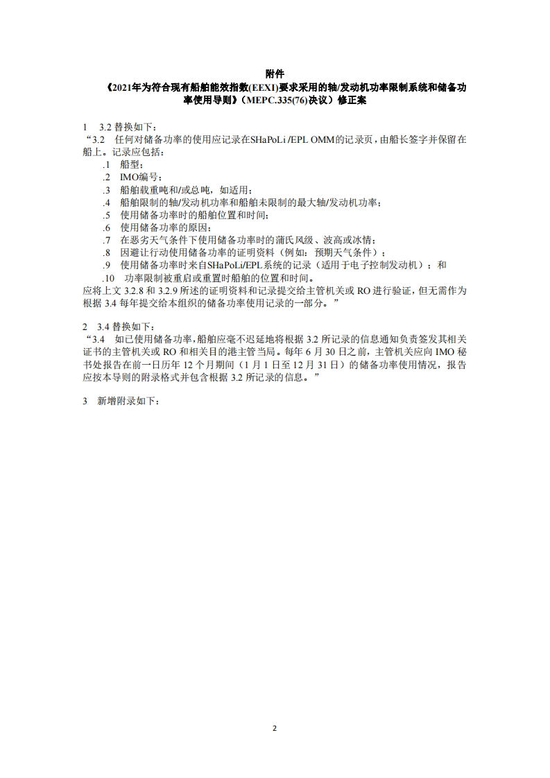 环保会MEPC.375(80)决议(2023年7月7日通过)《2021年为符合现有船舶能效指数EEXD要求采用的轴/发动机功率限制系统和储备功率使用导则》(MEPC.335(76决议)修正案海上环境保护委员会,忆及《国际海事组织公约》关于防止和控制船舶造成海洋污染国际公约赋予海上环境保护委员会职能的第38(a)条,注意到包含强制性目标型技术和操作措施以减少国际航运碳强度的2021年MARPOL附则VI的修正案于2022年11月1日生效,还注意到船舶可配备轴/发动机功率限制系统以满足第25条的要求(Required EEXⅪ),进一步注意到本委员会在其第76届会议上通过的MEP℃.335(76)决议《2021年为符合现有船舶能效指数(EEXⅫ要求采用的轴/发动机功率限制系统和储备功率使用导则》,在其第80届会议上,审议了提出的《2021年为符合现有船舶能效指数(EEX①要求采用的轴/发动机功率限制系统和储备功率使用导则》的修正案,1通过《2021年为符合现有船舶能效指数EEX①要求采用的轴/发动机功率限制系统和储备功率使用导则》的修正案,其文本载于本决议附件:2要求MARPOL附则VI的各缔约国和其他成员国政府使船长、海员、船东、船舶经营者和任何其他相关方注意到附件中的导则修正案。1