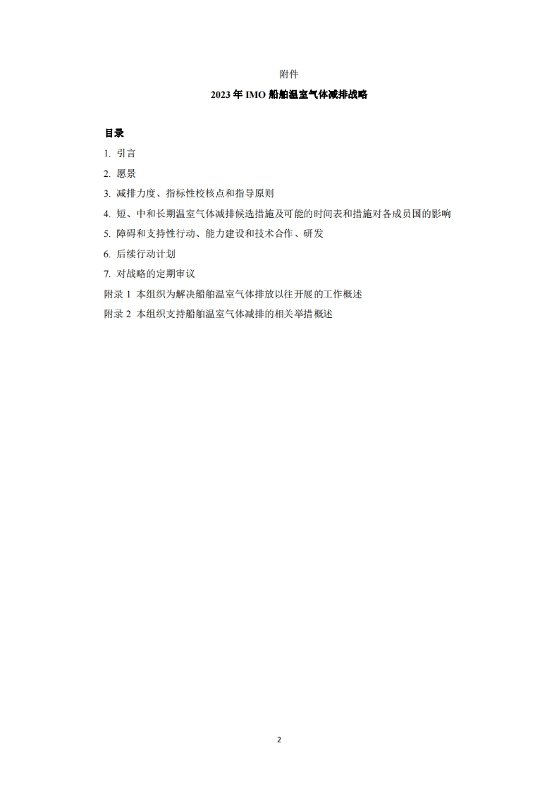 环保会MEPC.377(80)决议(2023年7月7日通过)2023年M0船舶温室气体减排战略海上环境保护委员会,忆及国际海事组织公约第38()条关于海上环境保护委员会(本委员会)的职能,即就本组织范围内有助于防止和控制船舶造成海上污染的任何其他事项审议并采取适当行动,认识到本组织自1997年9月通过关于船舶二氧化碳排放的大会第8号决议以来一直在开展解决船上温室气体(GHG)排放的工作,尤其是对适用MARPOL附则VI的船舶通过了全球强制性的技术和操作能效措施,还认识到大会于2017年12月和2021年12月分别召开的第30届和第32届会议上决定为本组织批准名为“应对气候变化”的战略方向,忆及本委员会于2018年4月在第72届会议(MEP℃72)上以MEPC.304(72)决议通过了《MO船舶温室气体减排初步战略》(《MO GHG初步战略》),注意到《O GHG初步战略》预计应于2023年通过经修订的《O GHG战略》,忆及联合国2030年可持续发展议程,还忆及联合国气候变化大会(COP21)通过的《巴黎协定》,其确定的长期目标是将全球平均气温较前工业化时期上升幅度控制在2摄氏度以内,并努力将温度上升幅度限制在1.5摄氏度以内,认识到这将显著降低气候变化的风险和影响,COP26的《格拉斯哥气候公约》和COP27的《沙姆沙伊赫实施计划》也重申了这一点,进一步忆及MO大会A.998(25)决议关于制定和实施新文件及现有文件修正案的能力建设需要,忆及海上安全委员会在其第107届会议上决定启动关于“制定安全监管框架以支持使用新技术和替代燃料的船舶减少温室气体排放”的工作,在其第80届会议上审议了2023年MO船舶温室气体减排战略草案,1.通过《2023年IMO船舶温室气体减排战略》(《2023年MO GHG战略》),其文本载于本决议附件:2.认识到发展中国家,尤其是最不发达国家(LDC)和发展中小岛国(SDS)在实施2023年MO船舶温室气体减排战略时可能面临的挑战:3.还认识到在安全实施《2023年MO船舶温室气体减排战略》时,解决人为因素的重要性,包括对海员和其他海事专业人员的影响:4.提请秘书长在综合技术合作项目(TCP)、MO温室气体技术信托基金和《2023年MO船舶温室气体减排战略》后续行动有关的任何其他支持方式中给与充分的准备,这些行动可能由本委员会进一步确定后由发展中国家执行,尤其是最不发达国家(LDC)以及发展中小岛国(SIDS):5.同意保持对《2023年MO船舶温室气体减排战略》的审议,以便在2028年通过经修订的MO船舶温室气体减排战略。6.还同意《2023年MO船舶温室气体减排战略》自即日起废除《2018年IMO船舶温室气体减排初步战略》。