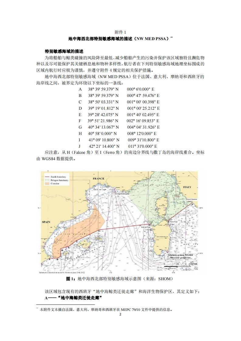 环保会MEPC.380(80)决议(2023年7月7日通过)指定地中海西北部为特别敏感海域海上环境保护委员会,忆及《国际海事组织公约》关于防止和控制船舶造成海洋污染国际公约赋子海上环境保护委员会职能的第38(a条,认识到地中海西北部海域的生态衡准,尤其是关于独特性或稀缺性、关键栖息地、依赖关系、脆弱性和生物地理的衡准,与社会、经济和文化以及科学和教育的衡准,及其易受国际航运活动破坏的脆弱性,以及法国、意大利、摩纳哥和西班牙为解决这种脆弱性而采取的措施,注意到A.982(24)决议通过并经MEPC.267(68)决议修正的《经修订的确定和指定特别敏感海域指南》(经修订的PSSA指南)和MEPC.l/Circ.510通函所述的《向IMO提交PSSA提案的指导性文件》,还注意到《减少与鲸类碰撞风险的指导文件》(MEPC.1/CirC.674通函)规定了一些措施以降低船舶与大型鯨类碰撞的风险,已同意地中海西北部符合经修订的PSSA指南规定的确定和指定特别敏感海域(PSSA)的衡准,已注意到航行安全、通信与搜救NCSR)分委会在其第10次会议上,同意了在地中海西北部特别敏感海域内一系列相关保护措施(APM)的建议案草案,以解决船舶与大型鲸类碰撞的问题,同时考虑相关保护措施的一般性质,海上安全委员会在其第107届会议上,同意航行安全、通信与搜救NCSR)分委会可直接参照这些相关保护措施至MEPC80,旨在主要促进海洋环境保护的信息共享,1.指定附件1所述的地中海西北部为特别敏感海域:2.请各成员国政府认识到本决议附件2所述的地中海西北部的生态、社会经济和科研衡准,以及本决议附件3所述的其易受国际航运活动破坏的脆弱性:和3.还请各成员国政府注意针对该区域脆弱性而规定的相关保护措施,其细节载于本决议附件4,并要求悬挂其国旗的船舶按这些措施行事。