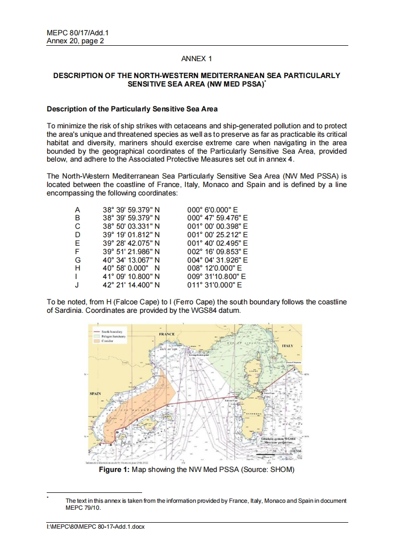 MEPC 80/17/Add.1Annex 20,page 1ANNEX 20RESOLUTION MEPC.380(80)(adopted on 7 July 2023)DESIGNATION OF THE NORTH-WESTERN MEDITERRANEAN SEA AS APARTICULARLY SENSITIVE SEA AREATHE MARINE ENVIRONMENT PROTECTION COMMITTEE.RECALLING Article 38(a)of the Convention on the International Maritime Organizationconcerning the functions of the Marine Environment Protection Committee conferred upon itby international conventions for the prevention and control of marine pollution from ships,BEING AWARE of the ecological criteria,in particular relating to uniqueness or rarity,criticalhabitat,dependency,fragility and bio-geographic criteria,and the social,economic andcultural,and scientific and educational criteria of the North-Western Mediterranean Sea Areaas well as its vulnerability to damage by international shipping activities and the steps takenby France,Italy,Monaco and Spain to address that vulnerability,NOTING the Revised guidelines for the identification and designation of Particularly SensitiveSea Areas adopted by resolution A.982(24)as amended by resolution MEPC.267(68),(Revised PSSA Guidelines),and the Guidance document for submission of PSSA proposalsto /MO set forth in MEPC.1/Circ.510,NOTING ALSO the Guidance document for minimizing the risk of ship strikes with cetaceans(MEPC.1/Circ.674)sets out a number of measures to reduce the risk of collision between largecetaceans and ships.HAVING AGREED that the criteria for the identification and designation of a ParticularlySensitive Sea Area (PSSA)provided in the Revised PSSA Guidelines are fulfilled for theNorth-Western Mediterranean Sea,HAVING NOTED that the Sub-Committee on Navigation,Communications and Search andRescue(NCSR)at its tenth session agreed a set of draft recommended associated protectivemeasures (APMs)within a Particularly Sensitive Sea Area in the North-Western MediterraneanSea,which address ship strikes with cetaceans,and that the Maritime Safety Committee,atits one-hundredth and seventh session,agreed that these APMs could be referred by theNCSR Sub-Committee directly to MEPC 80,taking into account the general nature of theAPMs,aiming at infommation-sharing primarily for contributing to the protection of the marineenvironment,1DESIGNATES the North-Western Mediterranean Sea,as defined in annex 1,as aParticularly Sensitive Sea Area:2INVITES Member Governments to recognize the ecological,socio-economic andscientific criteria of the North-Western Mediterranean Sea area,set forth in annex 2 to thepresent resolution,as well as its vulnerability to damage by international shipping activities,asdescribed in annex 3 to this resolution;3ALSO INVITES Member Govemments to note the associated protective measuresestablished to address the area's vulnerability,the details of which are contained in annex 4 tothis resolution,and request ships flying their flag that they act in accordance with suchmeasures.I:MEPC80MEPC 80-17-Add.1.docx