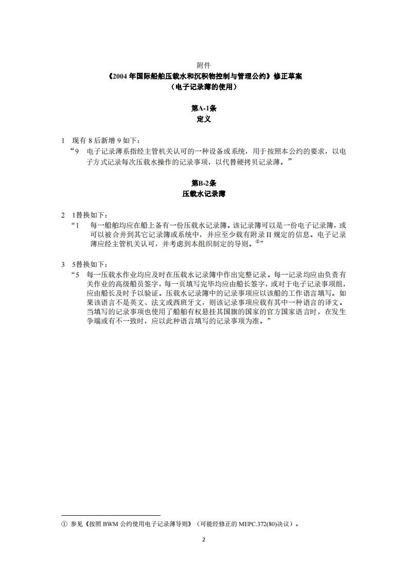 环保会MEPC.383(81)决议(2024年3月22日通过)《2004年国际船舶压载水和沉积物控制与管理公约》修正案第A-1和B-2条修正案(电子记录薄的使用)海上环境保护委员会,忆及《国际海事组织公约》关于防止和控制船舶造成海洋污染国际公约赋子海上环境保护委员会职能的第38(a)条,还忆及《2004年国际船舶压载水和沉积物控制与管理公约》(BWM公约)第19条,该条规定了修正程序并赋予本组织海上环境保护委员会审议公约修正案供各缔约国通过的职能,在其第81届会议上,审议了BWM公约附录Ⅱ关于压载水记录薄格式的提出的修正案,1按BWM公约第192)(c)条规定,通过BWM公约附录Ⅱ的修正案,其文本载于本决议附件:2按BWM公约第19(2(©))条规定,决定该修正案于2025年4月1日应视为已被接受,除非在此日期之前,有三分之一以上的缔约国通报秘书长反对该修正案:3提请各缔约国注意,按BWM公约第19(2)))条规定,该修正案在按上述2被接受后,应于2025年10月1日生效:4要求秘书长按BWM公约第19(2)()条规定,将核准无误的本决议及其附件中的修正案文本的副本分发给所有公约缔约国:5还要求秘书长将本决议及其附件的副本分发给非BWM公约缔约国的本组织成员:6进一步要求秘书长制定BWM公约核准无误的综合文本。y