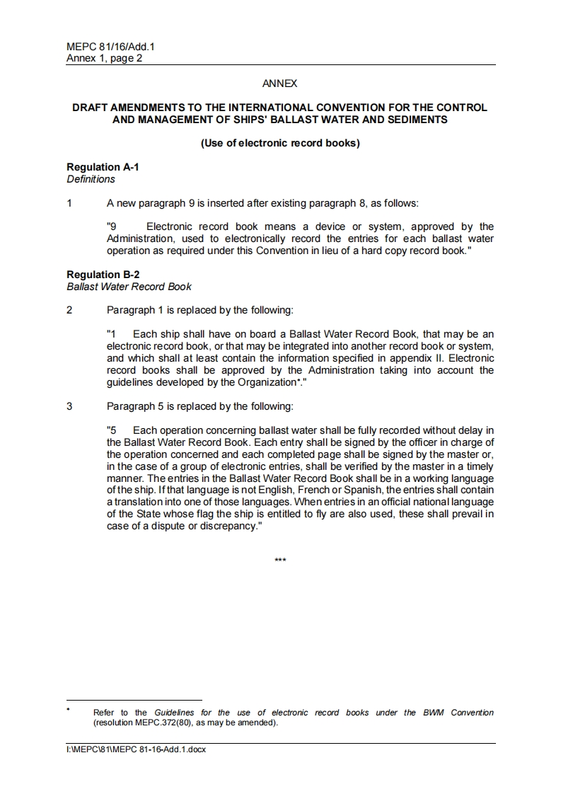 MEPC 81/16/Add.1Annex 1,page 1ANNEX 1RESOLUTION MEPC.383(81)(adopted on 22 March 2024)AMENDMENTS TO THE INTERNATIONAL CONVENTION FOR THE CONTROL ANDMANAGEMENT OF SHIPS'BALLAST WATER AND SEDIMENTS,2004Amendments to regulations A-1 and B-2(Use of electronic record books)THE MARINE ENVIRONMENT PROTECTION COMMITTEE,RECALLING Article 38(a)of the Convention on the International Maritime Organizationconcerning the functions of the Marine Environment Protection Committee conferred upon itby international conventions for the prevention and control of marine pollution from ships,RECALLING ALSO article 19 of the International Convention for the Control and Managementof Ships'Ballast Water and Sediments,2004 (the BWM Convention),which specifies theamendment procedure and confers upon the Marine Environment Protection Committee of theOrganization the function of considering amendments thereto for adoption by the Parties,HAVING CONSIDERED,at its eightieth session,proposed amendments to appendix ll of theBWM Convention regarding the form of Ballast Water Record Book,ADOPTS,in accordance with article 19(2)(c)of the BWM Convention,amendmentsto appendix ll,the text of which is set out in the annex to the present resolution;2DETERMINES,in accordance with article 19(2)(e)(ii)of the BWM Convention,thatthe amendments shall be deemed to have been accepted on 1 April 2025 unless,prior to thatdate,more than one third of the Parties have notified the Secretary-General that they object tothe amendments;3INVITES the Parties to note that,in accordance with article 19(2)(f)(ii)of the BWMConvention,the said amendments shall enter into force on 10ctober 2025 upon theiracceptance in accordance with paragraph 2 above;4REQUESTS the Secretary-General,for the purposes of article 19(2)(d)of the BWMConvention,to transmit certified copies of the present resolution and the text of theamendments contained in the annex to all Parties to the BWM Convention;ALSO REQUESTS the Secretary-General to transmit copies of the present resolutionand its annex to Members of the Organization which are not Parties to the BWM Convention;6FURTHER REQUESTS the Secretary-General to prepare a consolidated certified textof the BWM Convention.I:MEPC81MEPC 81-16-Add.1.docx